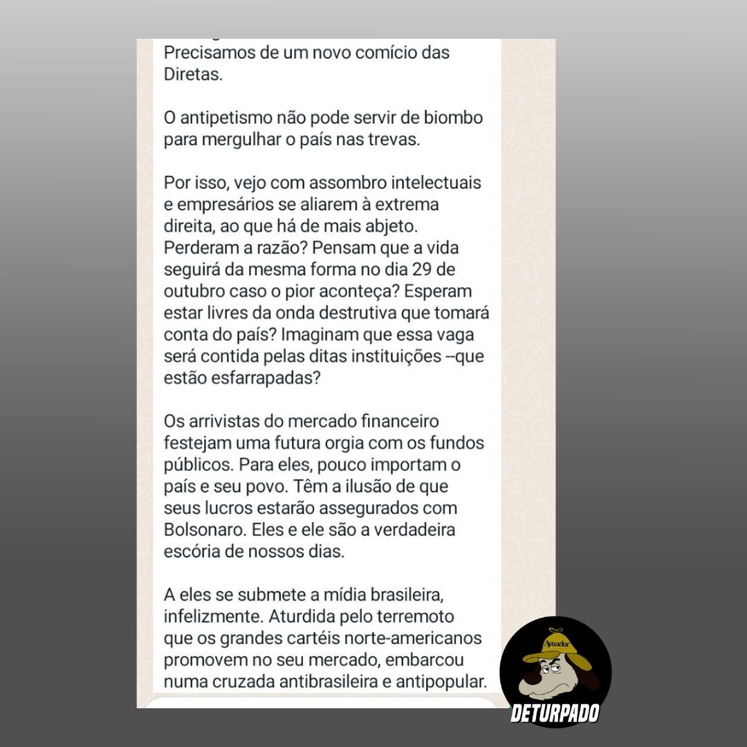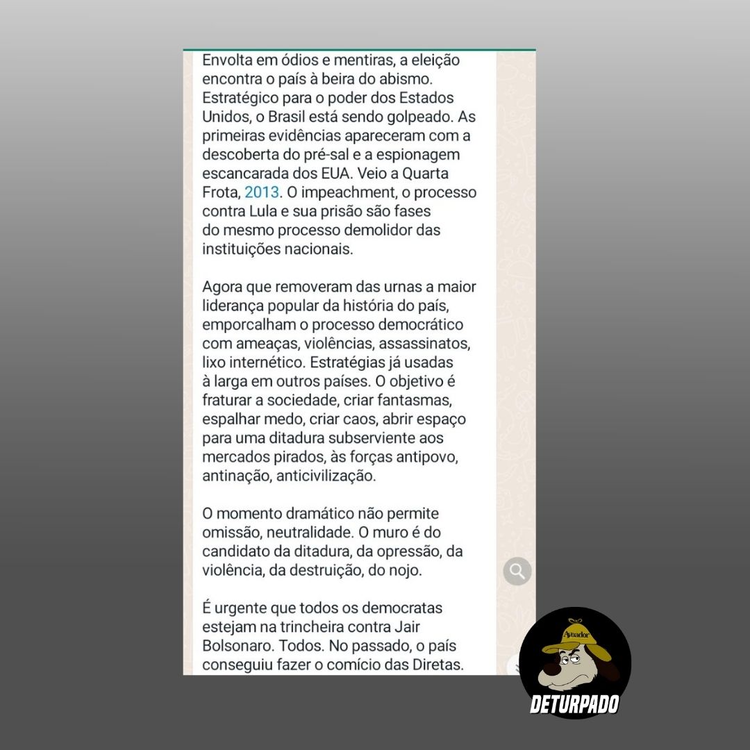 Na mensagem encaminhada nos grupos de Whatsapp, também chama a atenção que o texto não segue com um link para direcionar o leitor à publicação original no site da Folha de S. Paulo, coloca-se apenas o conteúdo, que, dessa forma, pode até ser modificado. Além disso, apesar da primeira frase da mensagem dar a entender que se trata de uma publicação recente, o texto é de 25 de outubro de 2018, às vésperas do segundo turno das eleições presidenciais.