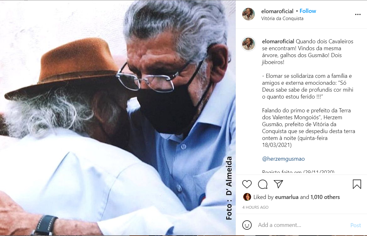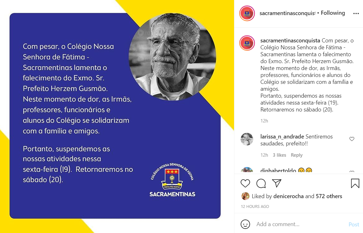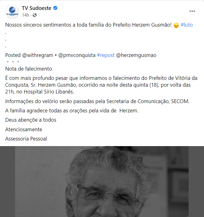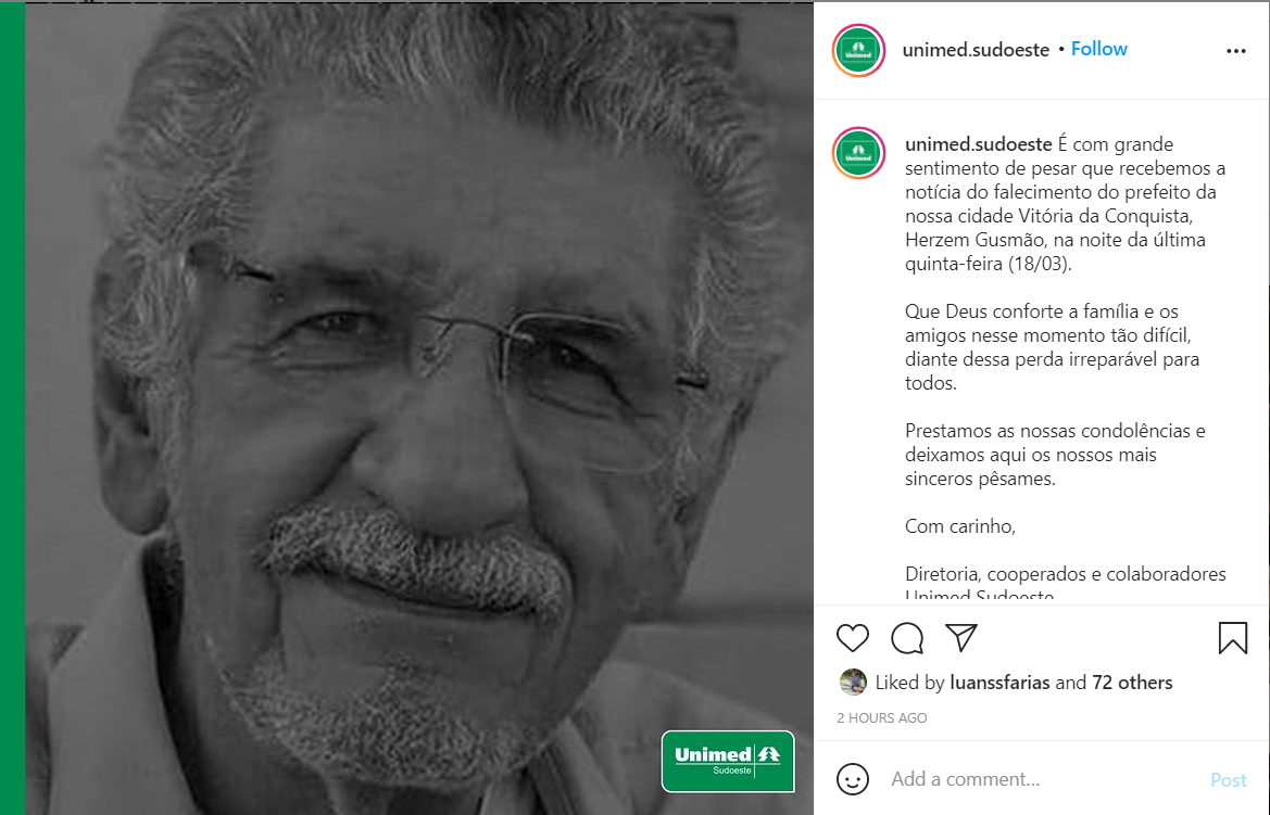 Nas redes sociais, a morte do prefeito de Vitória da Conquista gerou grande repercussão nas últimas 24 horas 19 de março de 2021 Érika CamargoA notícia da morte do prefeito de Vitória da Conquista, Herzem Gusmão, na noite de quinta-feira (18), por complicações provocadas pela covid-19, gerou repercussão, de ontem para hoje, nas redes sociais. Políticos de diferentes partidos e cargos em governos, artistas, empresários e pessoas comuns manifestaram o sentimento de pesar pela morte de Gusmão. Nesta sexta-feira (19/03), o assunto chegou ao trending topics do Twitter. Confira algumas das publicações.