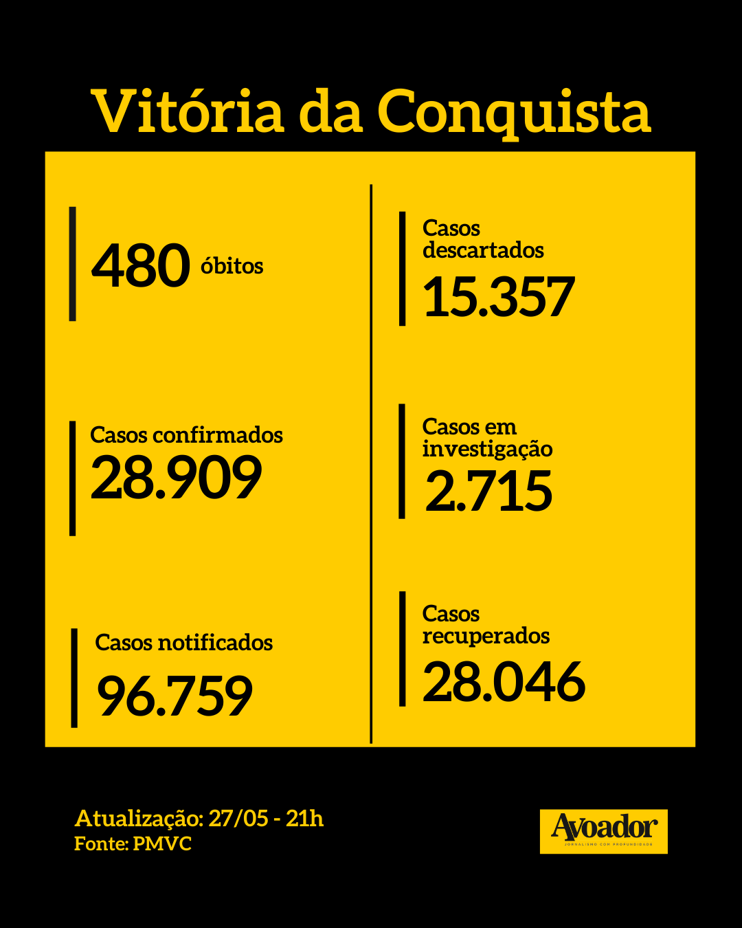 Confira abaixo os dados de Vitória da Conquista, da Bahia, do Brasil e do mundo.