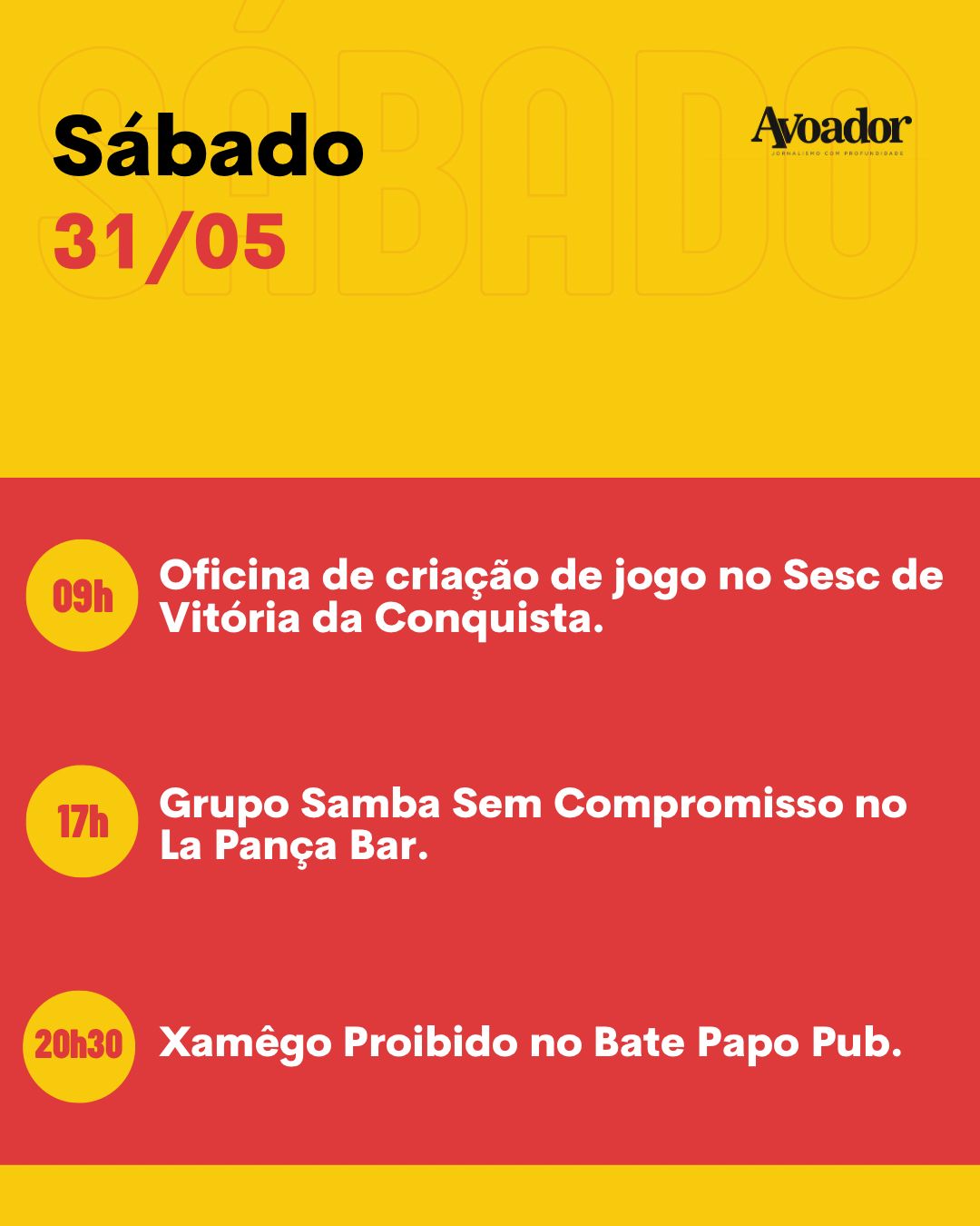 Acompanhe as próximas agendas culturais do site Avoador. Fique por dentro dos principais eventos de lazer, cultura e entretenimento em Vitória da Conquista através do nosso Instagram e site.