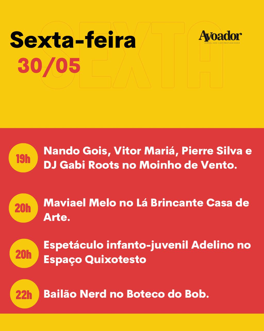 Na sexta-feira (30/05), Nando Gois, Vitor Mariá, Pierre Silva e DJ Gabi Roots animarão o restaurante Moinho de Vento, a partir das 19h. Às 20h, a casa de arte Lá Brincante receberá o poeta e cantor Maviael Melo. No mesmo horário, acontece o segundo dia do espetáculo infantojuvenil Adelino, uma produção da Companhia de Teatro Operakat, no Espaço Quixotesto. O Buteco do Bob, a partir das 22h, terá a primeira edição do Bailão Nerd em Conquista.