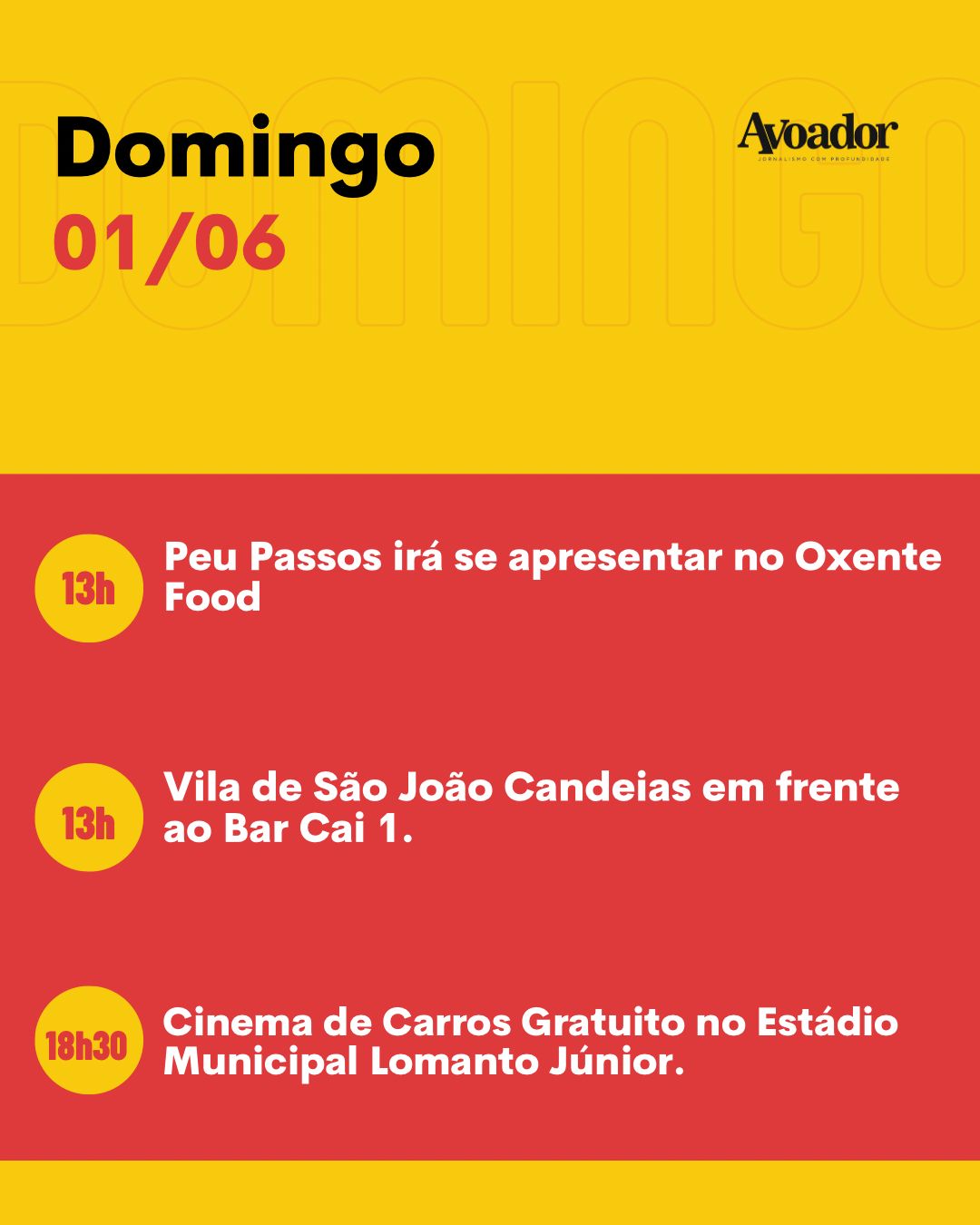 No domingo (01/06), o restaurante Oxente Food recebe o cantor de forró Peu Passos, às 13h. Em frente ao bar Cai 1, acontece a Vila de São João Candeias, das 13h às 22h. Finalizando o fim de semana, a partir das 18h30, acontecerá um cinema drive-in no estacionamento do Estádio Municipal Lomanto Júnior.