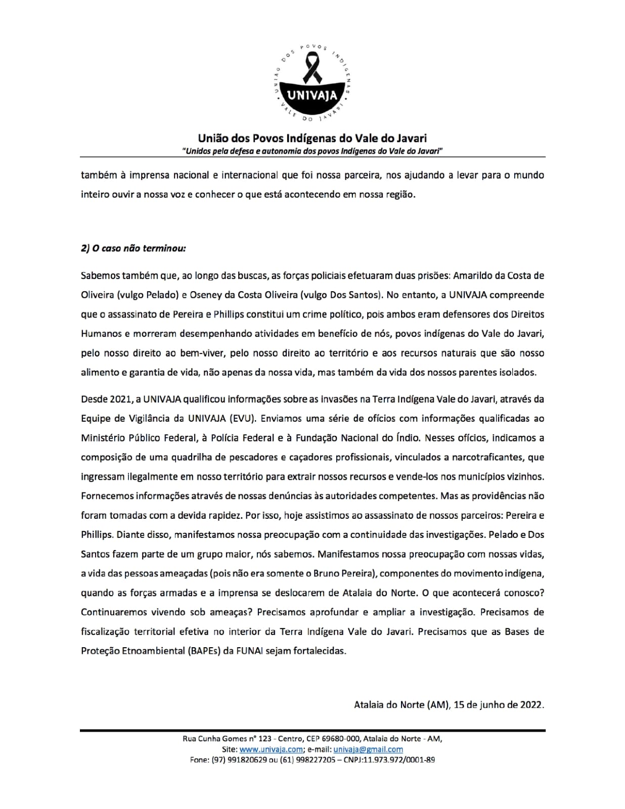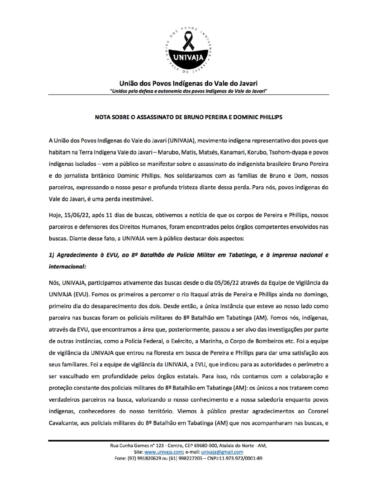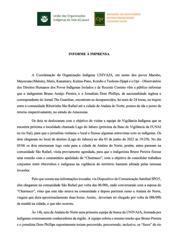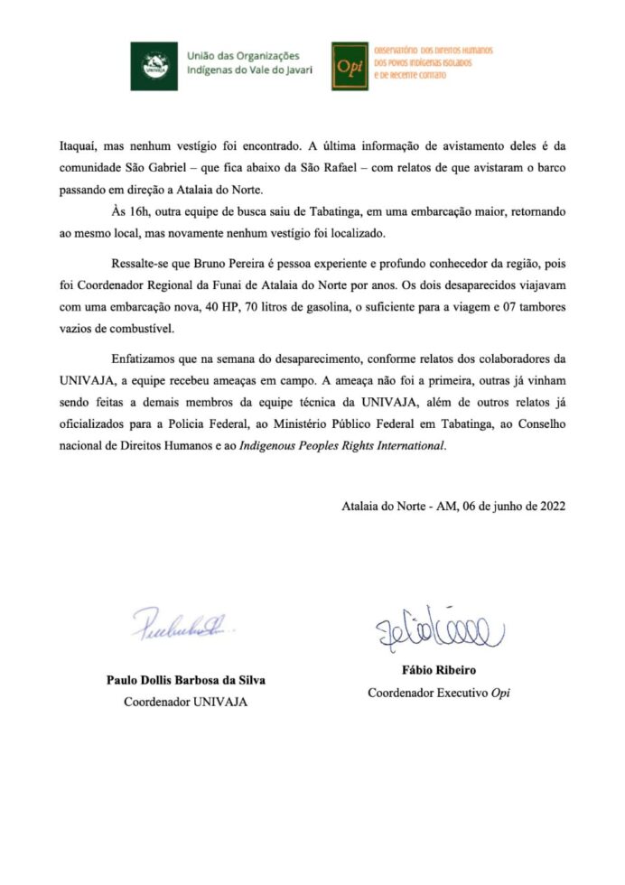 - Nota da Univaja publicada no dia 6 de junho, dia seguinte ao desaparecimento de Bruno e Dom