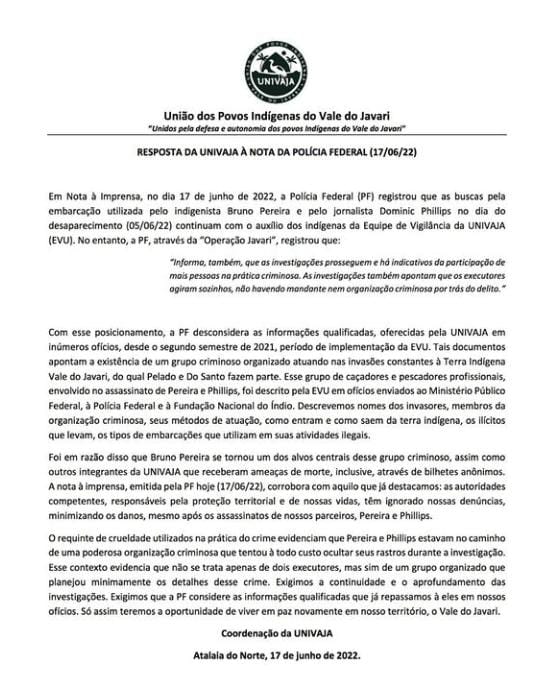 A Univaja rebateu a nota emitida nesta sexta-feira (17) pela Polícia Federal. O comunicado da PF diz que “não há mandante ou organização criminosa” por trás do assasinato do indigenista Bruno Pereira e do jornalista inglês Dom Phillips. Já a entidade indígena diz, em nota, que não concorda com essa afirmação da polícia.