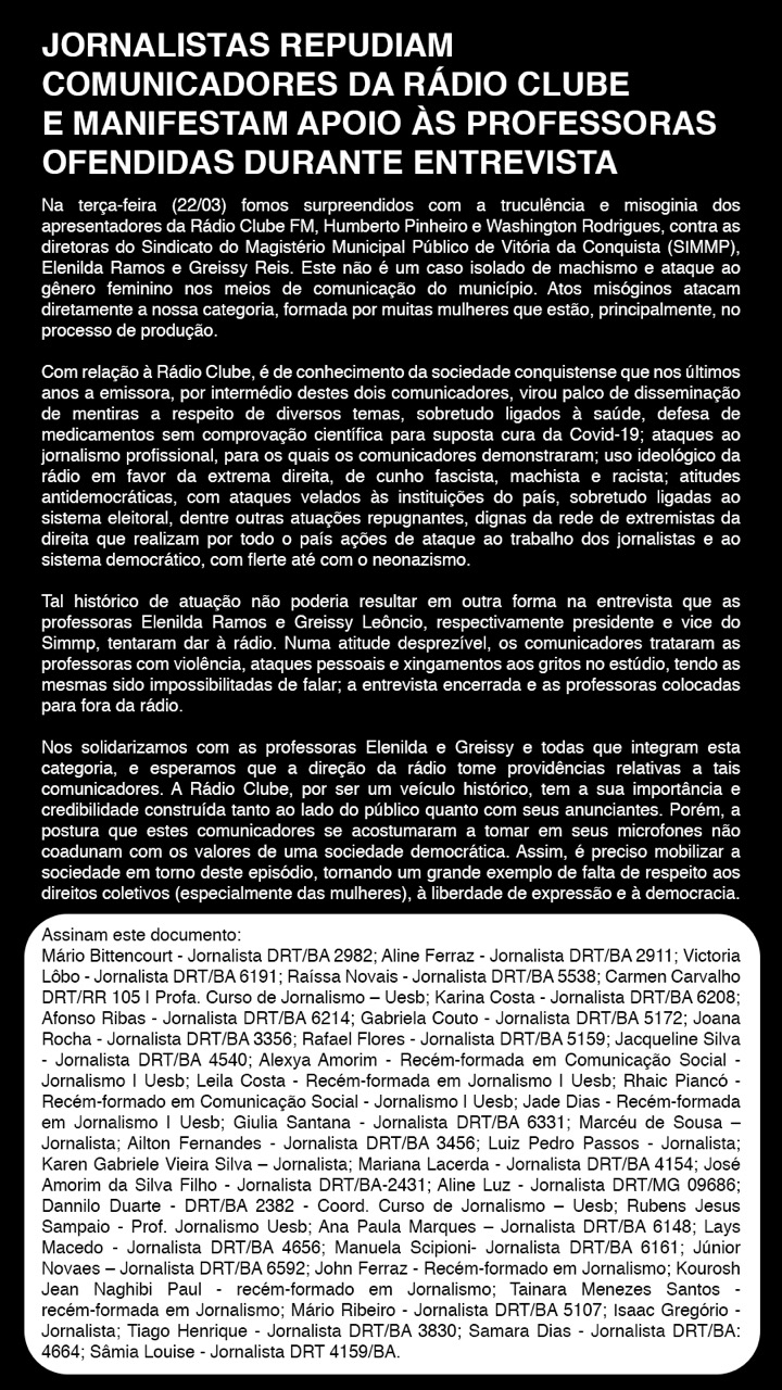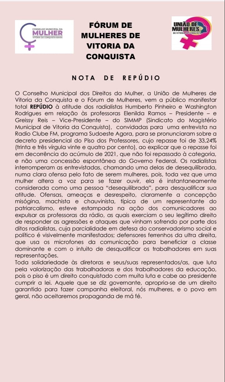 Entidades sindicais, movimentos sociais e coletivos de jornalistas publicaram notas de repúdio contra os comunicadores e a rádio 24 de março de 2022 Mikhaelle PiagioEm protesto contra as agressões machistas e desrespeitosas realizadas as dirigentes do Sindicato do Magistério Municipal Público de Vitória da Conquista (Simmp), nesta sexta-feira (25/03), às 8h, haverá uma ato público, com concentração na Câmara Municipal de vereadores. Além disso, coletivos de jornalistas e diversas entidades publicaram notas de repúdio contra as agressões.