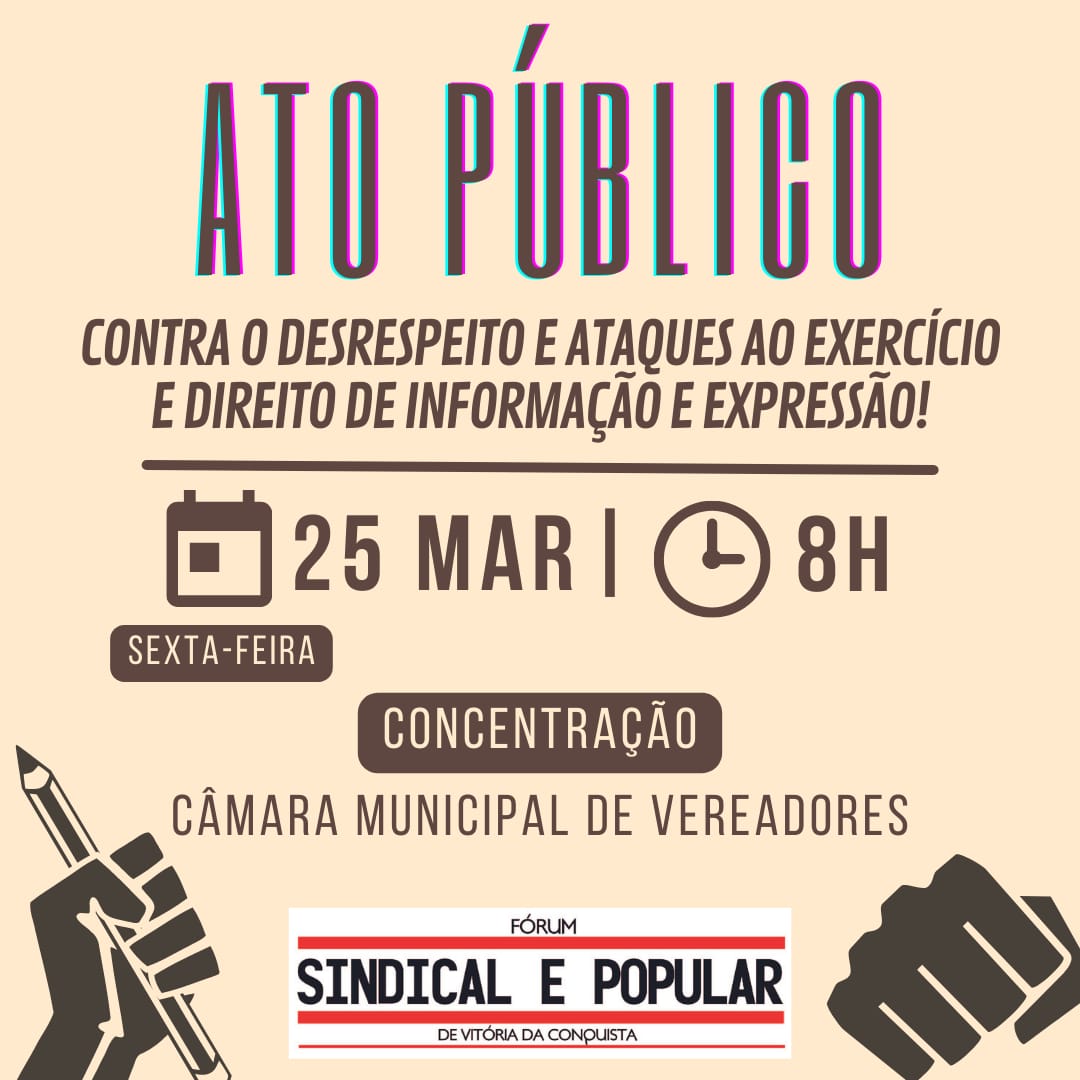 O ato que ocorrerá nesta sexta-feira (25/03) tem organização do Fórum Sindical e Popular de Vitória da Conquista. O evento foi marcado, após uma reunião entre representantes do Fórum e do Simmp.