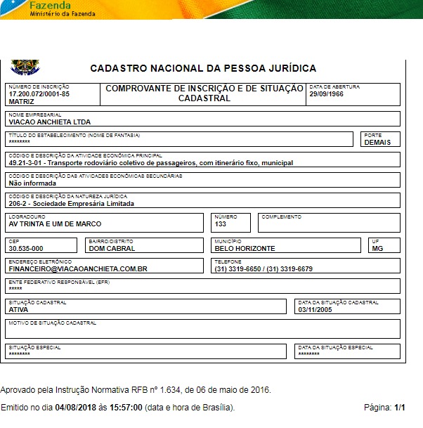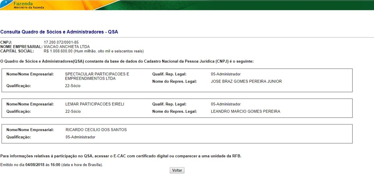 Procuramos também outras informações a respeito da empresa mineira, como o CNPJ, endereço e dados sobre o dono e sócios da Viação Anchieta. Com o objetivo de verificar a autenticidade da carta, nossa equipe comprovou, por meio do site da Receita Federal, a existência da empresa. Além disso, encontramos um suposto site que não contém informações sobre os seus serviços, mas apresenta as mesmas logormarcas estampadas na carta-proposta. A respeito dos responsáveis pela organização, foram citados na Receita Federal, os nomes José Braz Gomes Pereira Júnior, Leandro Márcio Gomes Pereira e Ricardo Cecílio dos Santos. Verifiquem a checagem nas imagens.