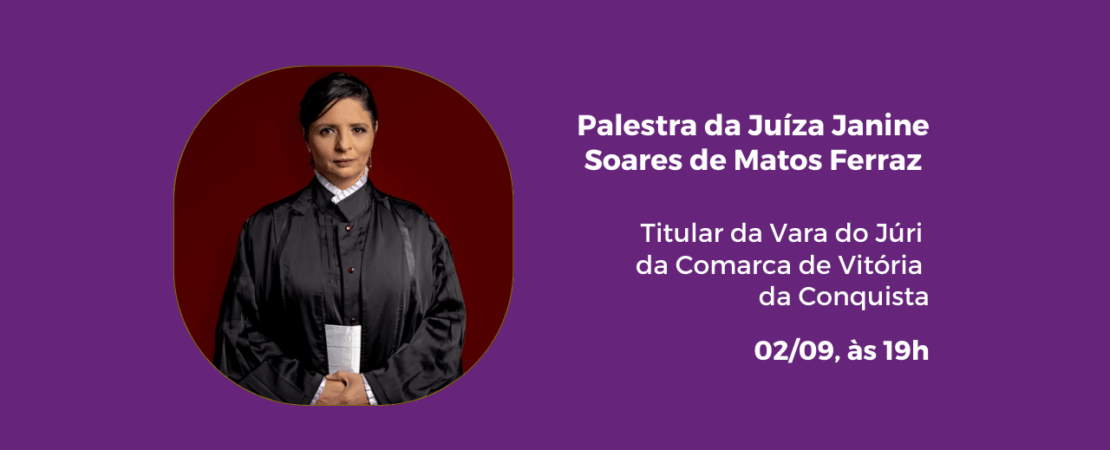 A palestrante será a juíza da Comarca de Vitória da Conquista, Janine Soares de Matos Ferraz. Ela é mestre em Segurança Pública, Justiça, Cidadania e Direitos Humanos pela Universidade Federal da Bahia (Ufba), graduada em Direito pela Universidade Estadual de Santa Cruz (Uesc) e especialista em Gestão de Pessoas, Docência no Ensino Superior e Justiça Restaurativa. Além disso, possui especialização em Métodos de Justiça Restaurativa e Comunicação Não Violenta.