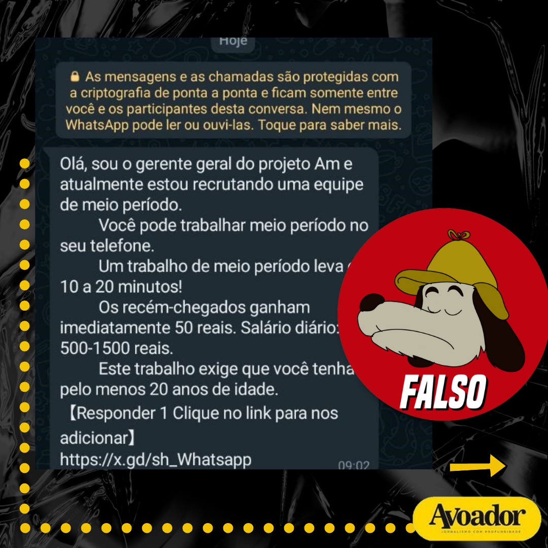 O anúncio compartilhado em grupos de Whatsapp tem por objetivo roubar dados dos interessados na vaga de trabalhoCirculam nos grupos de WhatsApp da região Sudoeste mensagens que oferece vaga de emprego em um suposto Projeto Am. A proposta, encaminhada por um indivíduo que se identifica como gerente, informa ainda que o trabalho é de meio período, com salário diário de 500 a 1500 reais e remuneração imediata de 50 reais, e traz um link com um formulário a ser preenchido pelo interessado. Uma leitora do site Avoador que recebeu a mensagem pediu a verificação. Confira o trabalho da Editoria Xereta.