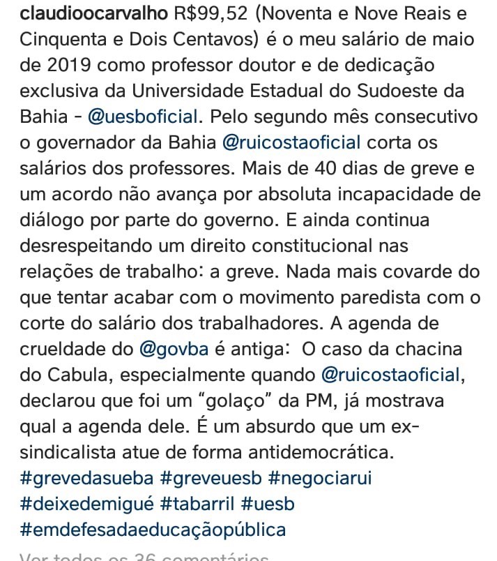 Por meio de seu perfil nas redes sociais, o professor de Direito da Uesb, Claudio Carvalho, também manifestou a sua revolta com o corte de salário. Na publicação, ele mostra que, como professor doutor e de dedicação exclusiva, recebeu R$99, 92. Carvalho afirma ainda que o governador Rui Costa “continua desrespeitando um direito constitucional nas relações de trabalho: a greve. Nada mais covarde do que tentar acabar com o movimento paredista com o corte do salário dos trabalhadores”.