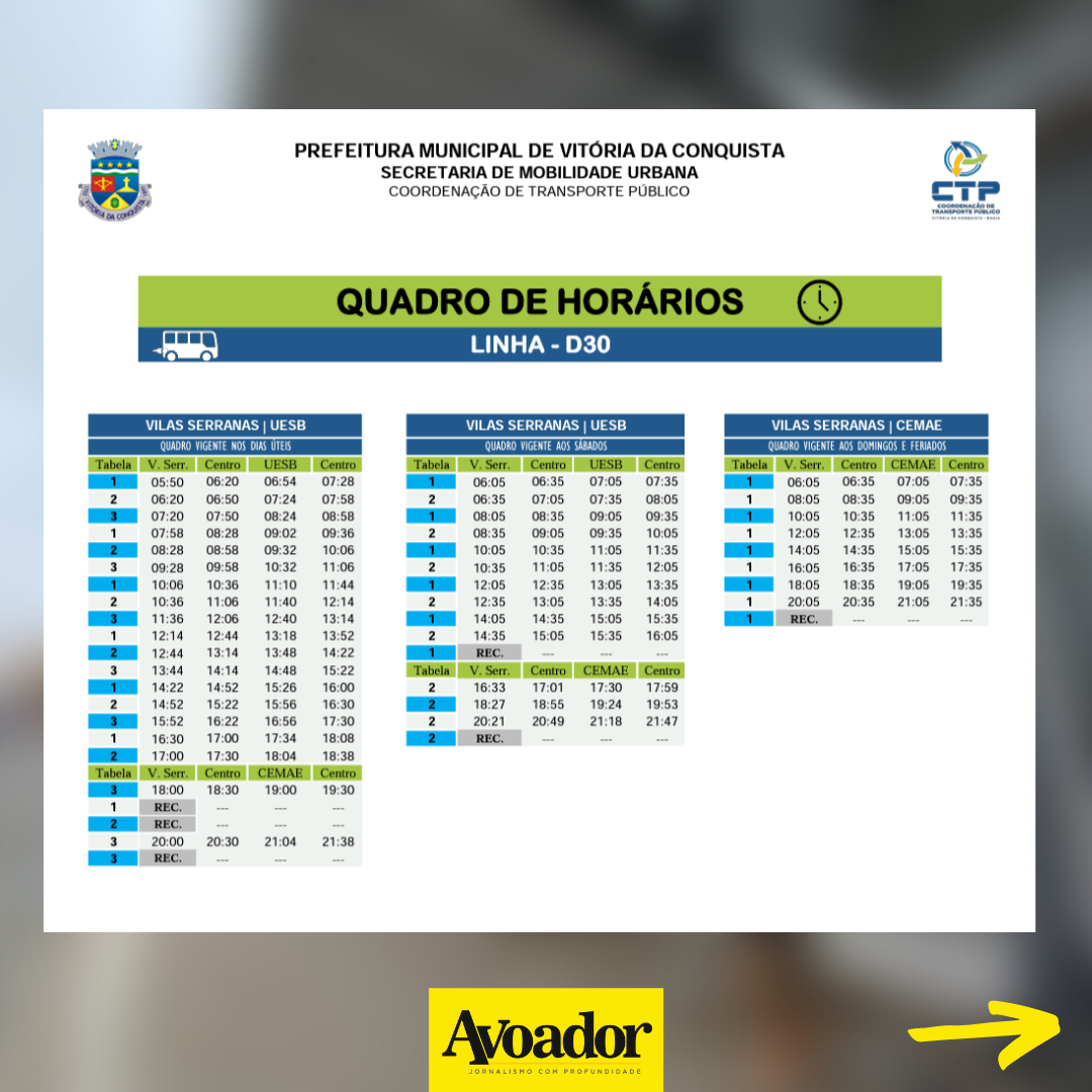 As linhas vão funcionar em horário especial até dia 28 de junho 23 de junho de 2021 Denilson SoaresNesta terça-feira (22/06), a Secretaria Municipal de Mobilidade Urbana (Semob) informou a mudança de duas linhas de ônibus coletivo urbano, durante o feriado de São João. As linhas D30, que faz o percurso Vilas Serranas e Uesb, e R01, responsável pelo caminho Vilas Serranas e Centro, terão um horário especial até a próxima segunda-feira (28/06).