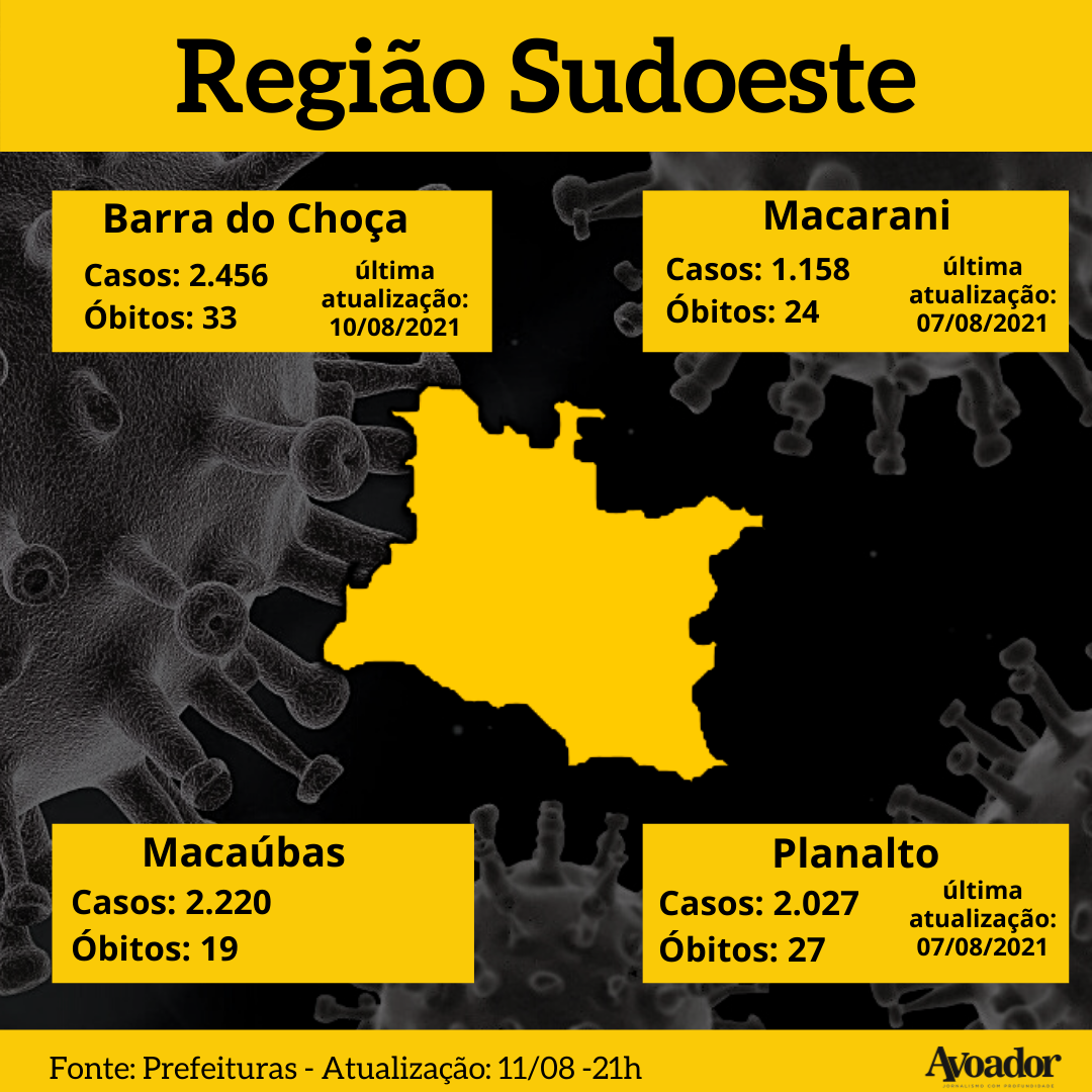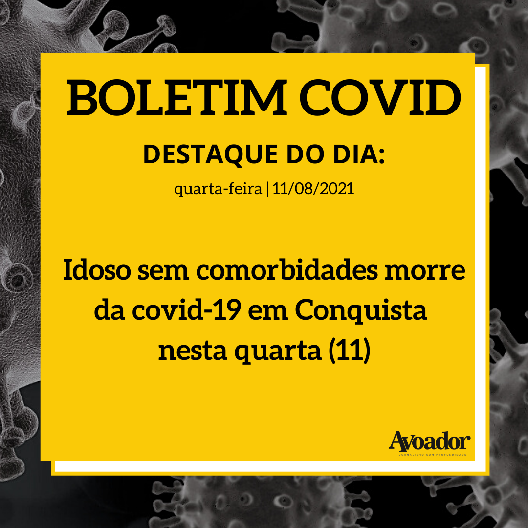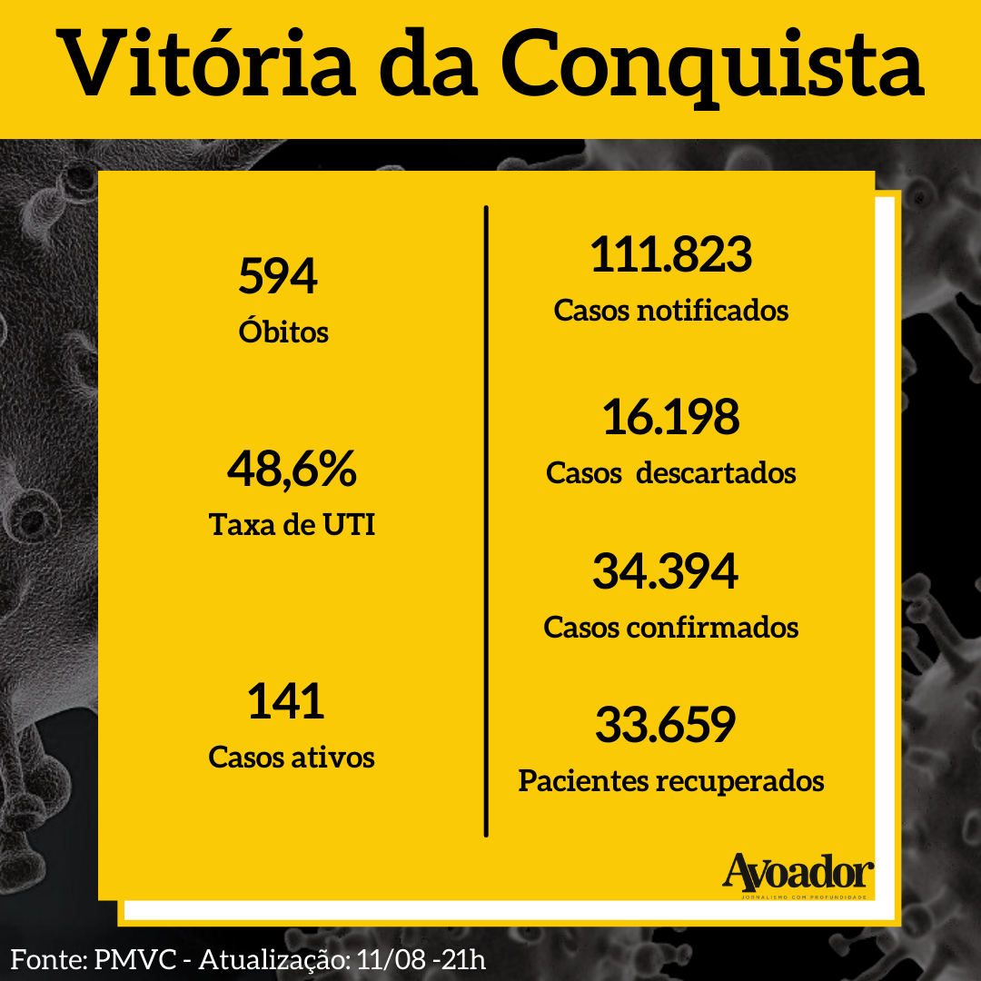 Confira a atualização dos números da covid-19 desta quarta-feira, 11 de agosto de 2021 11 de agosto de 2021 Gabriela SouzaA covid-19 foi responsável pela morte de uma mais pessoa em Vitória da Conquista nesta quarta-feira (11/08). Com esse registro, o município chega na triste marca de 594 vidas perdidas desde o início da pandemia de covid-19.