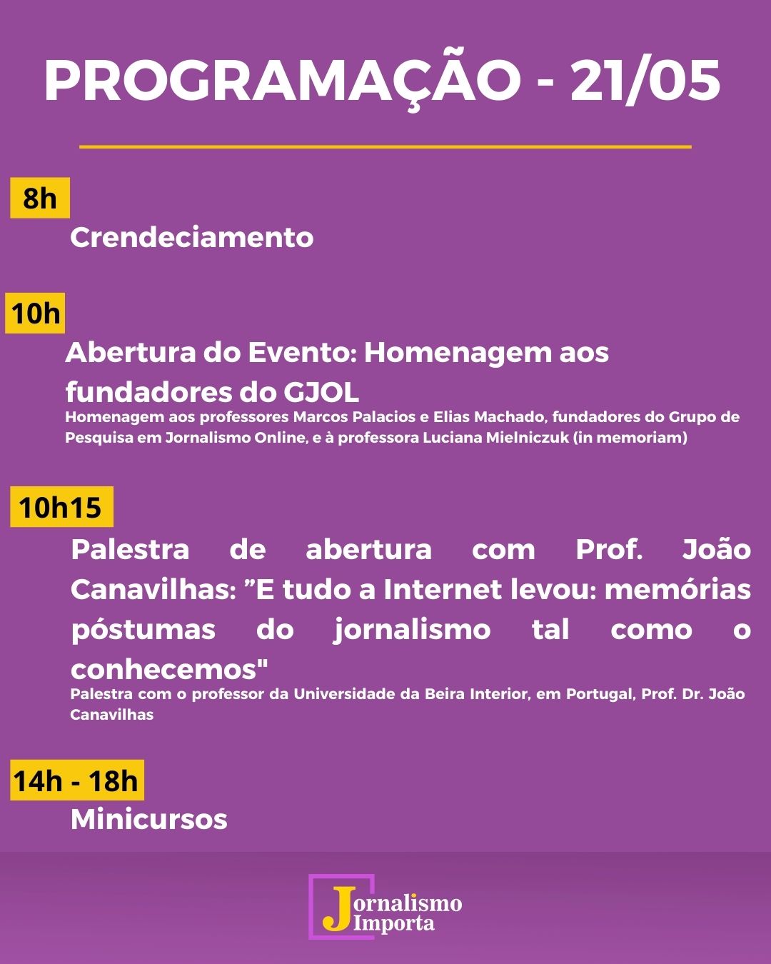 A programação começa dia 21 de maio, às 9h, com o credenciamento dos participantes na Faculdade de Comunicação (Facom) da Universidade Federal da Bahia (Ufba), em Salvador. Às 10h, ocorre a palestra de abertura com homenagem aos fundadores do GJOL e conta com os professores Suzana Barbosa e Washington Filho, ambos docentes da Facom. Às 10h15, o professor João Canavilhas da Universidade da Beira Interior (Covilhã – Portugal) realiza a palestra “E tudo a Internet levou: memórias póstumas do jornalismo tal como o conhecemos”.