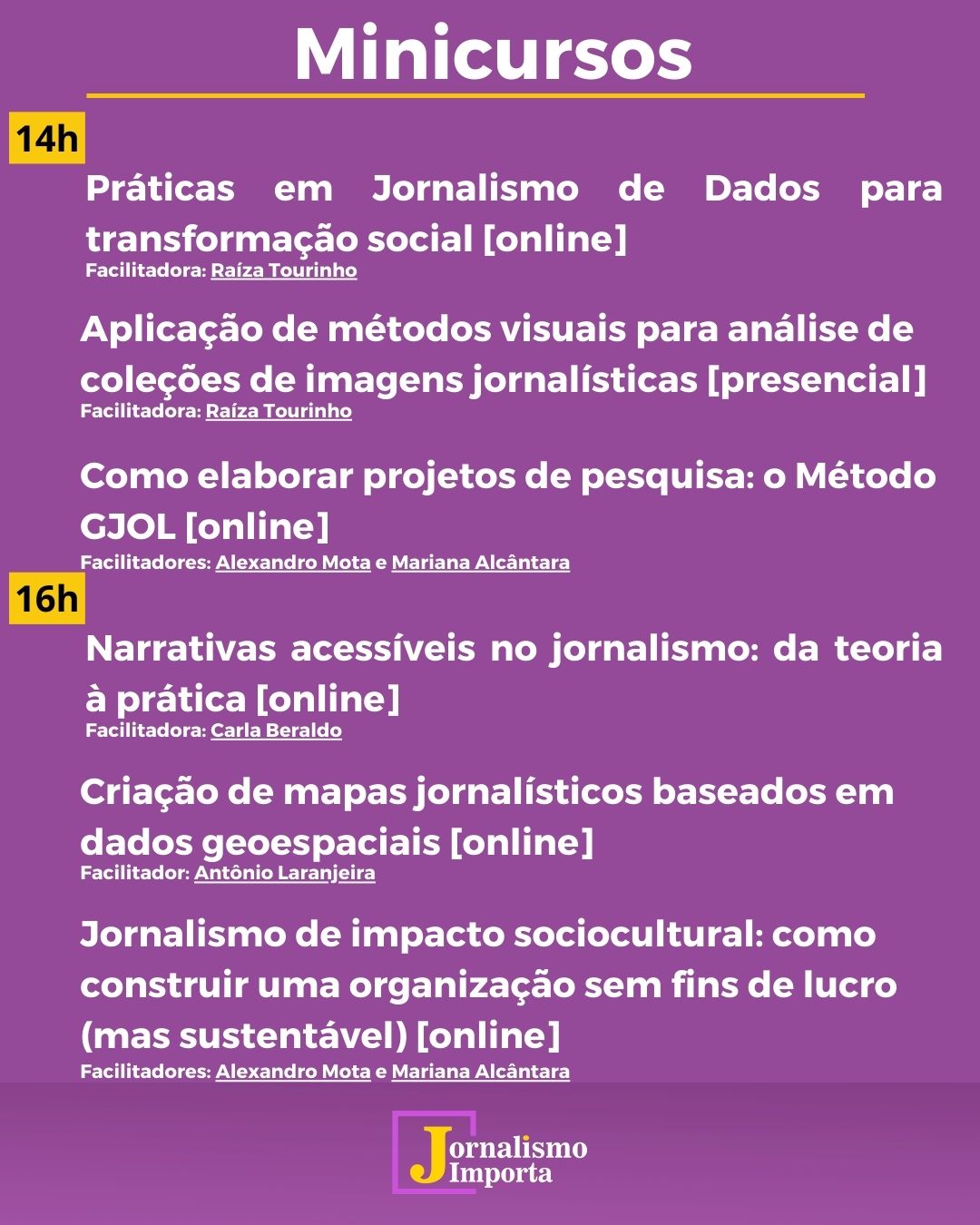 Já às 16h, mais três minicursos ocorreram de maneira online. “Narrativas acessíveis no jornalismo: da teoria à prática”, com a doutoranda em Comunicação e Cultura Contemporânea da Ufba, Carla Beraldo. O dourado em Comunicação e Cultura Contemporânea da Ufba ministra o minicurso “Criação de mapas jornalísticos baseados em dados geoespaciais”. E o último curso será ministrado pela jornalista e coordenadora de jornalismo do Nonada Jornalismo, Anna Ortega e pelo jornalista e diretor-executivo da Nonada Jornalismo, Rafael Gloria.