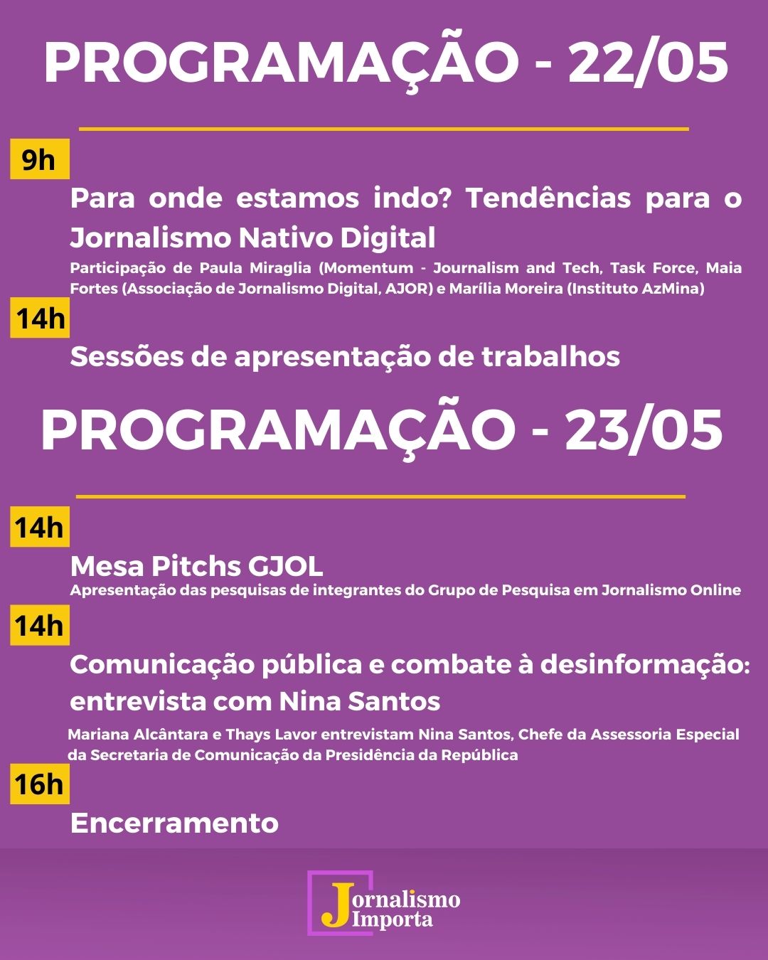 No dia 23 de maio, às 9h, o evento conta com a mesa-redonda Pitchs GJOL, com a apresentação das pesquisas de integrantes do Grupo de Pesquisa em Jornalismo Online. Às 14h, a jornalista e doutoranda no Programa de Pós-Graduação em Comunicação e Culturas Contemporâneas da Ufba, Mariana Alcântara, e a jornalista e pesquisadora, Thays Lavor entrevistaram a chefe da Assessoria Especial da Secretaria de Comunicação da Presidência da República, Nina Santos. Às 16h, acontecerá o encerramento do evento.