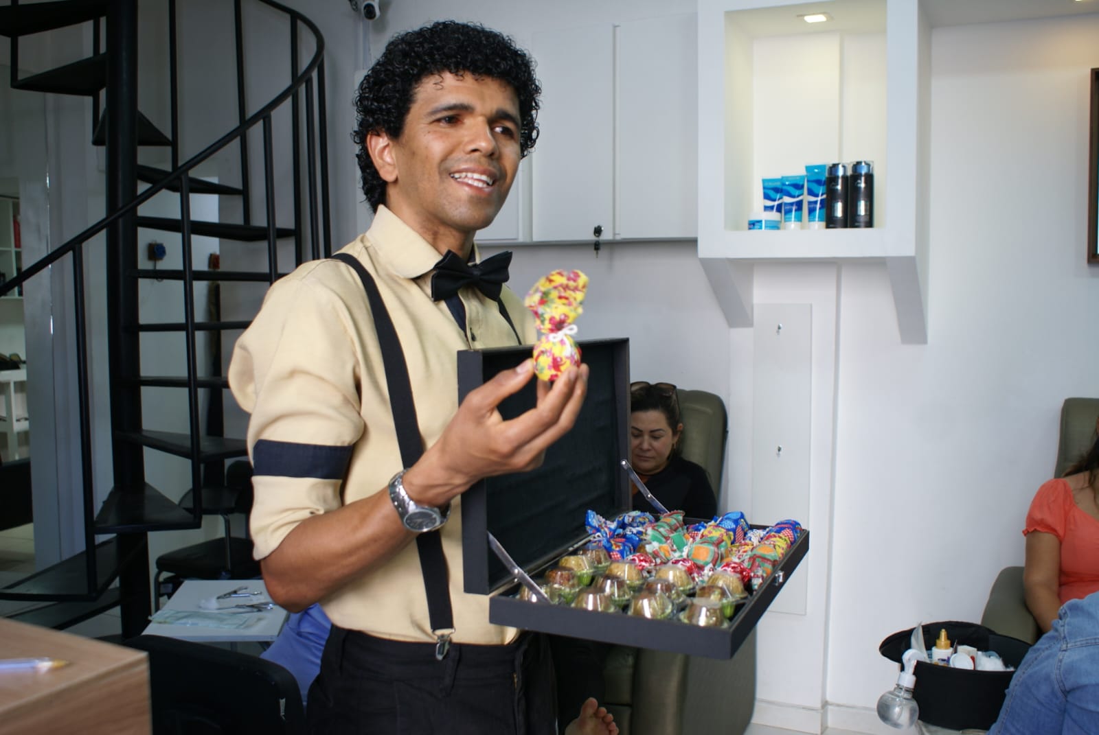 Além dos diferentes produtos, Jarderson também desenvolveu uma maneira peculiar de vender seus produtos de porta em porta, o terno e a maletinha personalizada de doces. “A ideia veio da Pâmela, pois o traje tinha que estar de acordo com as joias que contém dentro da maletinha. Levo comigo uma pequena amostra da essência da Dolce Pâtisserie, para que nos conheçam de uma maneira mais próxima, criando laços e novas experiências.”