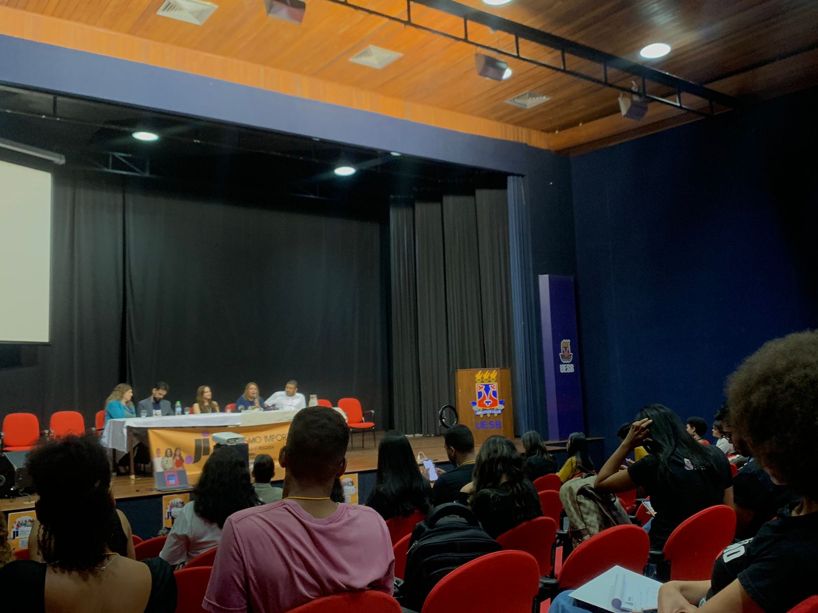 A mesa de abertura iniciou a partir das 8h40., com considerações sobre a importância do jornalismo, de ações de extensão e da universidade pública. Nela estiveram presentes o pró-reitor de Graduação da Uesb, professor Reginaldo Santos Pereira; a vice-diretora do Departamento de Filosofia e Ciências Humanas (DFCH), Marcela Pessoa; o criador do curso de Jornalismo, professor José Duarte; a presidente do Diretório Acadêmico Gregório de Matos, Nicole Prado, a coordenadora do curso de Jornalismo, Carmen Carvalho; e os convidados externos que contribuíram para concretizar o evento, a vereadora por Vitória da Conquista, Viviane Sampaio (PT); Gabriela Sousa, representante do vereador também de Conquista Alexandre Xandó (PT); Luciana Oliveira, representante da deputada Federal, Alice Portugal (PcdoB). “A gente almejava estar aqui, ver esse auditório lotado me enche de alegria. Agradeço a todos os professores e principalmente a professora Carmen (idealizadora do evento), que ficou ontem até de madrugada organizando o evento”, ressaltou Nicole