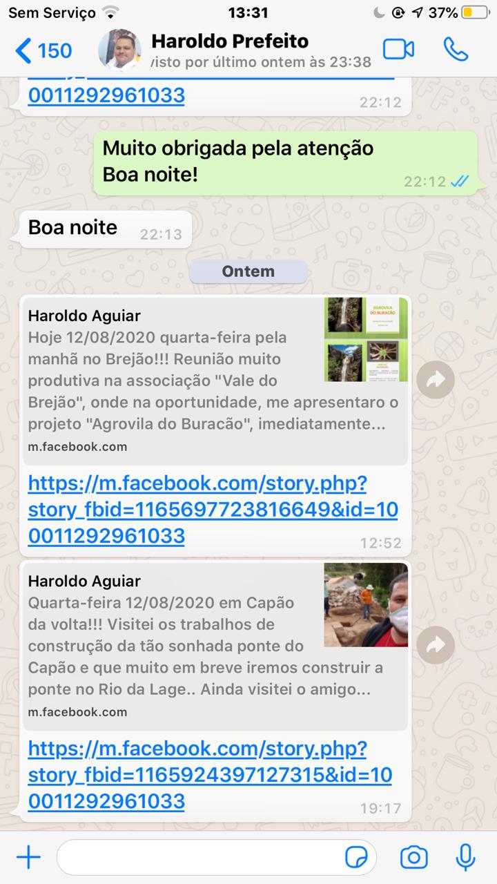 Em sua página no Facebook, Haroldo Aguiar (PSD) publicou fotos das denúncias que recebeu do Ministério Público da Bahia (MP-BA) e alegou ser perseguido pela oposição. Na postagem, ele disse que “nada me fará mudar minha forma de administar (sic) e abraçar nosso povo”.