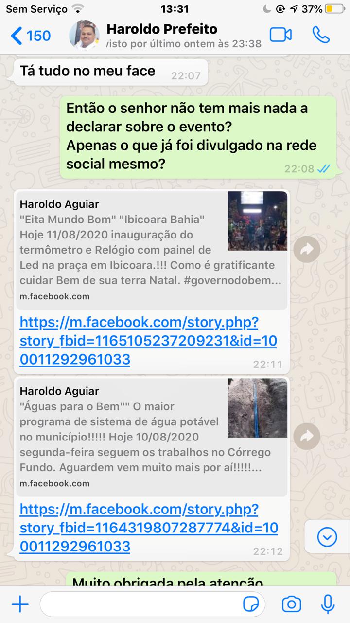 Em entrevista ao Avoador, Giovanni disse que, durante a produção da matéria publicada no Sudoeste Digital, ela entrou em contato com o prefeito para ouvir o seu posicionamento sobre a aglomeração em Mundo Novo. Como resposta, Aguiar apenas respondeu que tudo o que precisava ser dito estava em sua página no Facebook e enviou diversos links para a jornalista.