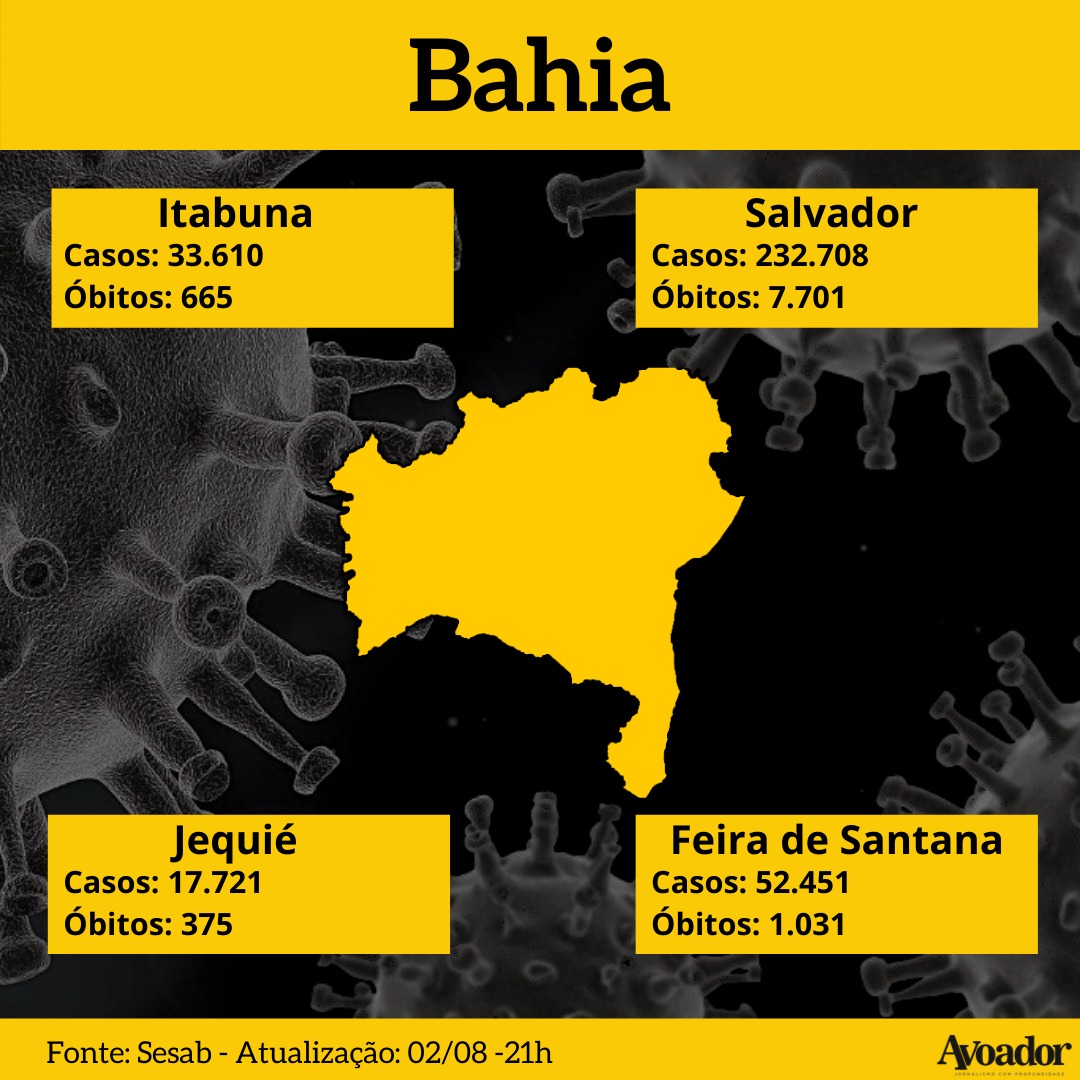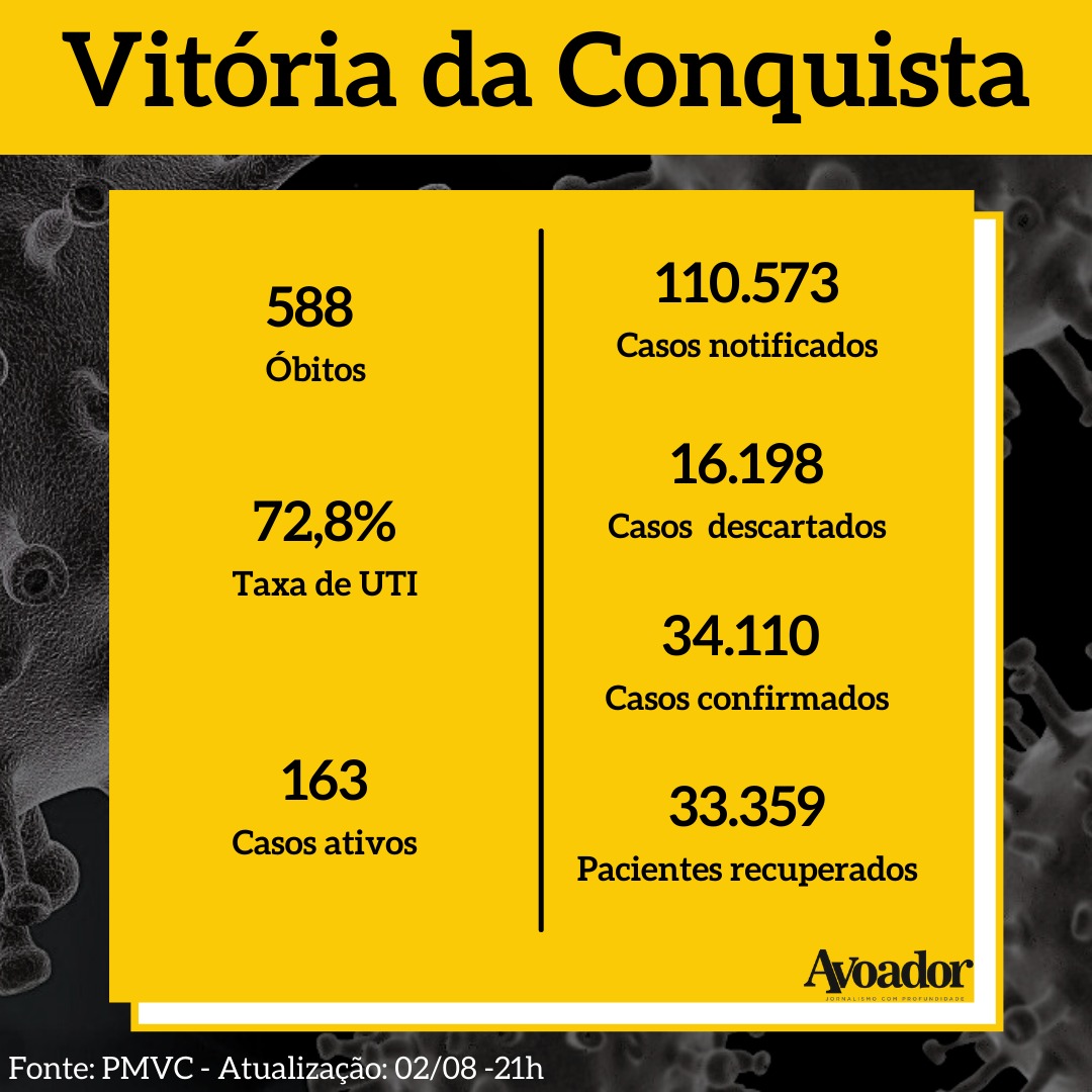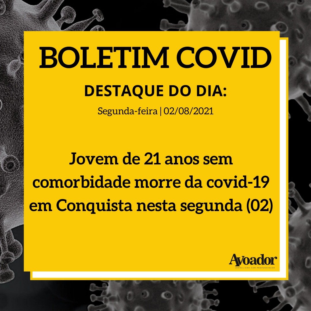 Confira a atualização dos números da covid-19 desta segunda-feira, 02 de agosto de 2021 2 de agosto de 2021 Mikhaelle PiagioNesta segunda-feira (02/08), dois homens foram registrados como vítimas fatais da covid-19 em Vitória da Conquista, um deles com apenas 21 anos e sem comorbidades. Com isso, o município chega a 588 mortes em decorrência da doença.