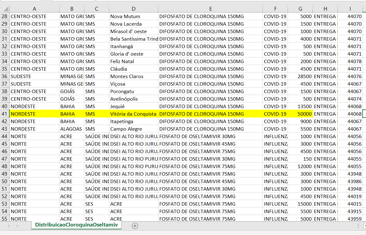 Um documento publicado em 17 de agosto de 2020 no Portal Brasileiro de Dados Abertos, ferramenta do Governo Federal para a disponibilização de dados públicos, demonstra que Conquista recebeu, em um só lote, 50.000 comprimidos de Diosfato de Cloroquina 150 mg.