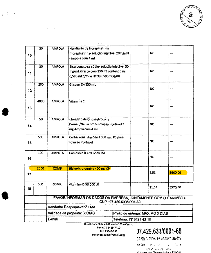 Em outro dado público, este de fevereiro de 2021, disponível no Portal de Transparência da PMVC, a Prefeitura lista alguns medicamentos requisitados à empresa Medisil Comercial Farmacêutica Hospitalar de Higiene e Transportes LTDA, entre os quais está a solicitação de 2.000 unidades de hidroxicloroquina no valor de R$ R$ 5.060,00.