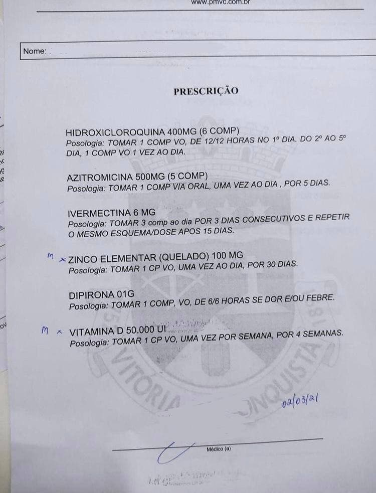 Nos postos da rede municipal de saúde, médicos têm receitado hidroxicloroquina, cloroquina, azitromicina, ivermectina. Uma advogada, que pediu para não ser identificada, contou que alguns membros de sua família foram diagnosticados com covid-19, se consultaram em unidades de saúde da cidade e vários profissionais prescreveram medicamentos do kit covid. “Um braço da minha família teve covid-19, inclusive o meu pai. A maioria dos médicos que consultamos receitou o tratamento precoce, do plantonista ao pneumologista”. Uma das receitas, entregue no início deste mês (02/03/21) com o brasão da Prefeitura, prescreve os medicamentos hidroxicloroquina, azitromicina, ivermectina, entre outros.