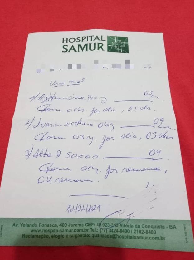 Outro paciente buscou o sistema privado de saúde, em 12 de fevereiro deste ano, e também recebeu a prescrição dos medicamentos que compõem o kit-covid. Eles pediram para não serem identificados, mas passaram pela mesma situação. “Meu padrasto foi atendido por um médico que receitou Ivermectina pra ele como prevenção, mesmo com o teste tendo dado negativo”.