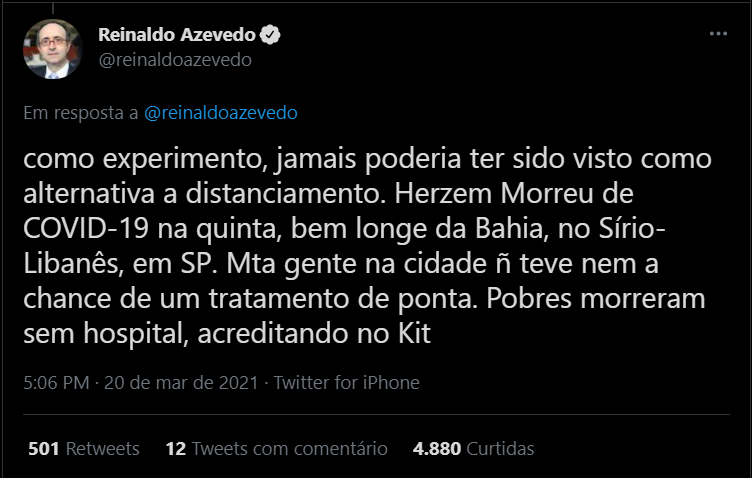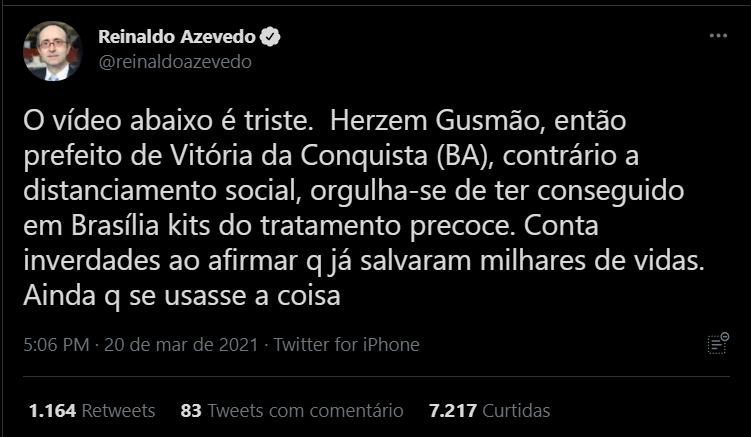 Em Vitória da Conquista, terceira maior cidade da Bahia, neste sábado (27/03), completa-se uma semana do velório e enterro do prefeito Herzem Gusmão, 72 anos, que era um dos defensores do kit-covid e morreu em consequência de sequelas causadas pela doença em 18 de março de 2021. Reeleito nas eleições municipais de 2020, divulgou ter positivado para o vírus em 7 dezembro, sendo internado 11 dias depois no hospital Samur (18/12/2020) e deu entrada no Hospital Sírio-Libanês (São Paulo) no dia 26 do mesmo mês, uma semana antes da data em que tomaria posse como prefeito. Chegou a ser empossado ainda internado no Hospital, por meio de videoconferência, no dia 8 de janeiro, mas não resistiu e acabou morrendo.