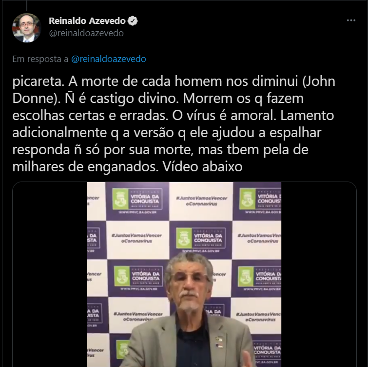 “A notícia boa”, explicou o ex-prefeito, “é que nós solicitamos ao Ministério da Saúde que mande para Vitória da Conquista a hidroxicloroquina”. Ele também informou que a Prefeitura iria comprar os fármacos ivermectina e azitromicina. “É mais uma providência em defesa da vida”, afirma.
