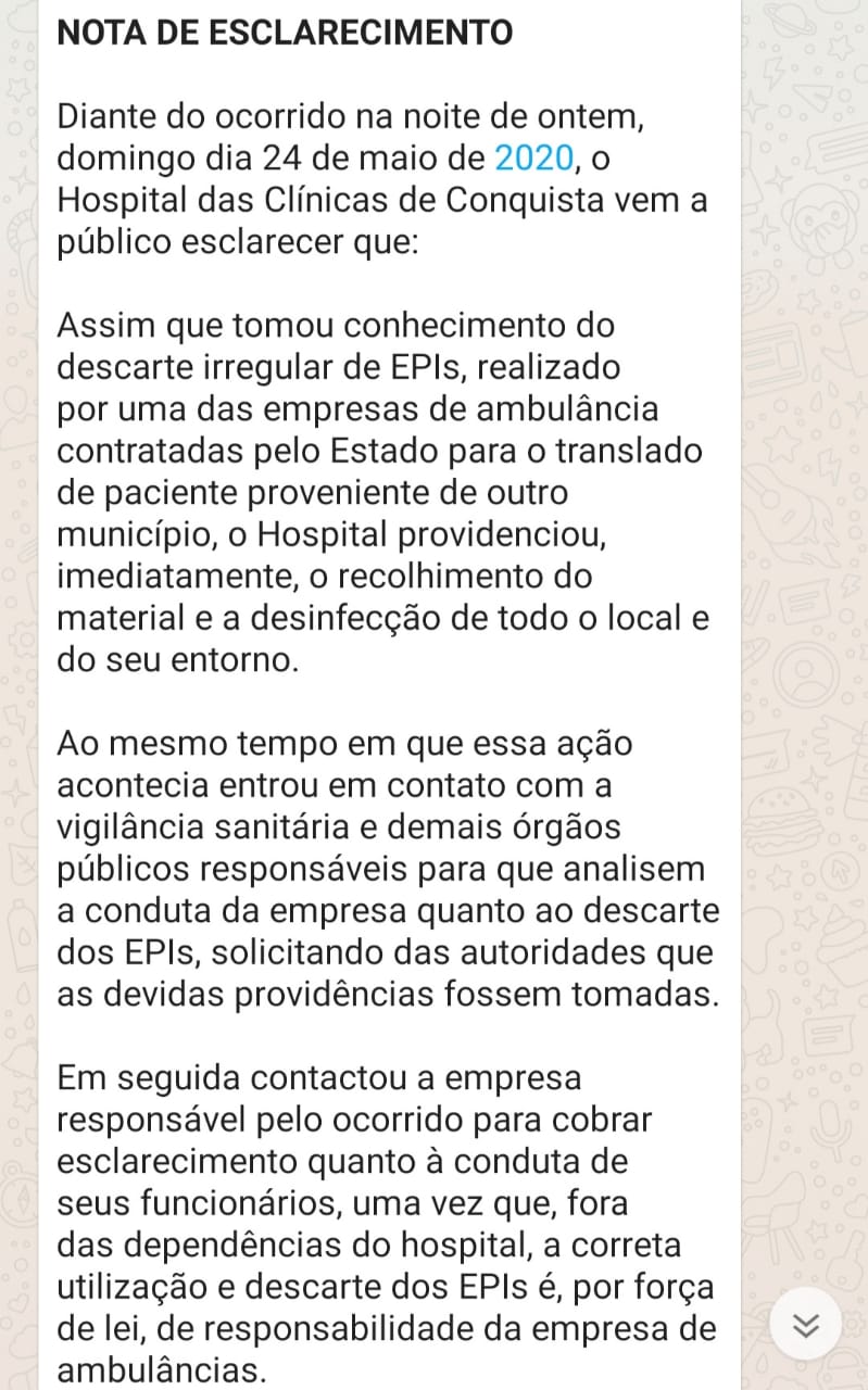 Na nota, o HCC disse ainda que entrou em contato com a Vigilância Sanitária e demais órgãos públicos responsáveis por punir a Vita Plus pelo descarte irregular, com a própria empresa de ambulâncias e com o seu departamento jurídico. O hospital ainda aproveitou o comunicado para informar à população que a desinfecção do local é realizada diariamente, de acordo os protocolos de higienização e segurança.