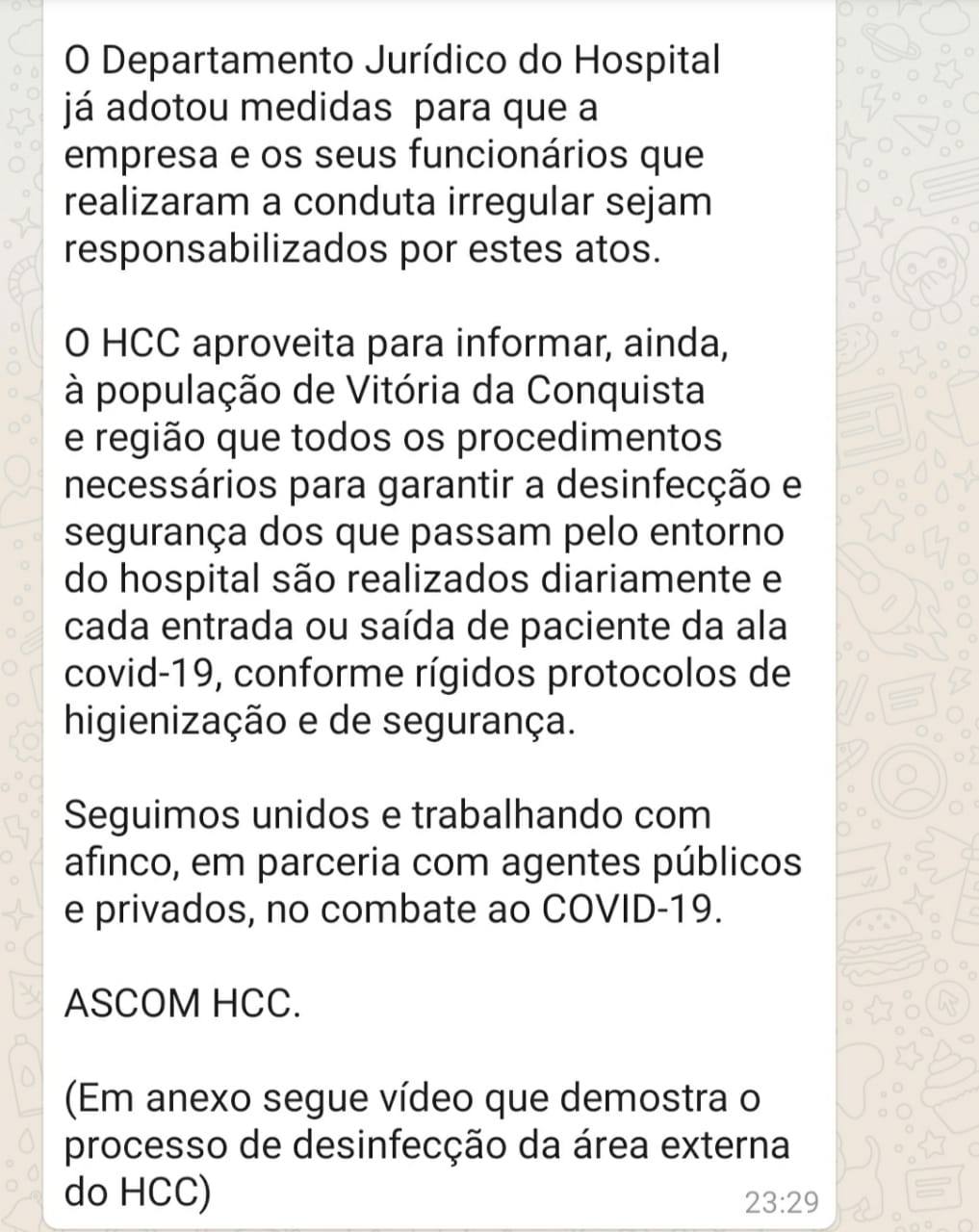 Por conta desse furo jornalístico, no dia seguinte, o HCC tomou uma atitude a respeito, fez a desinfecção do local e divulgou uma nota de esclarecimento. “Assim que tomou conhecimento do descarte irregular dos EPI’s, […] o Hospital providenciou, imediatamente, o recolhimento do material e a desinfecção de todo o local e do seu entorno”, diz um trecho da nota.