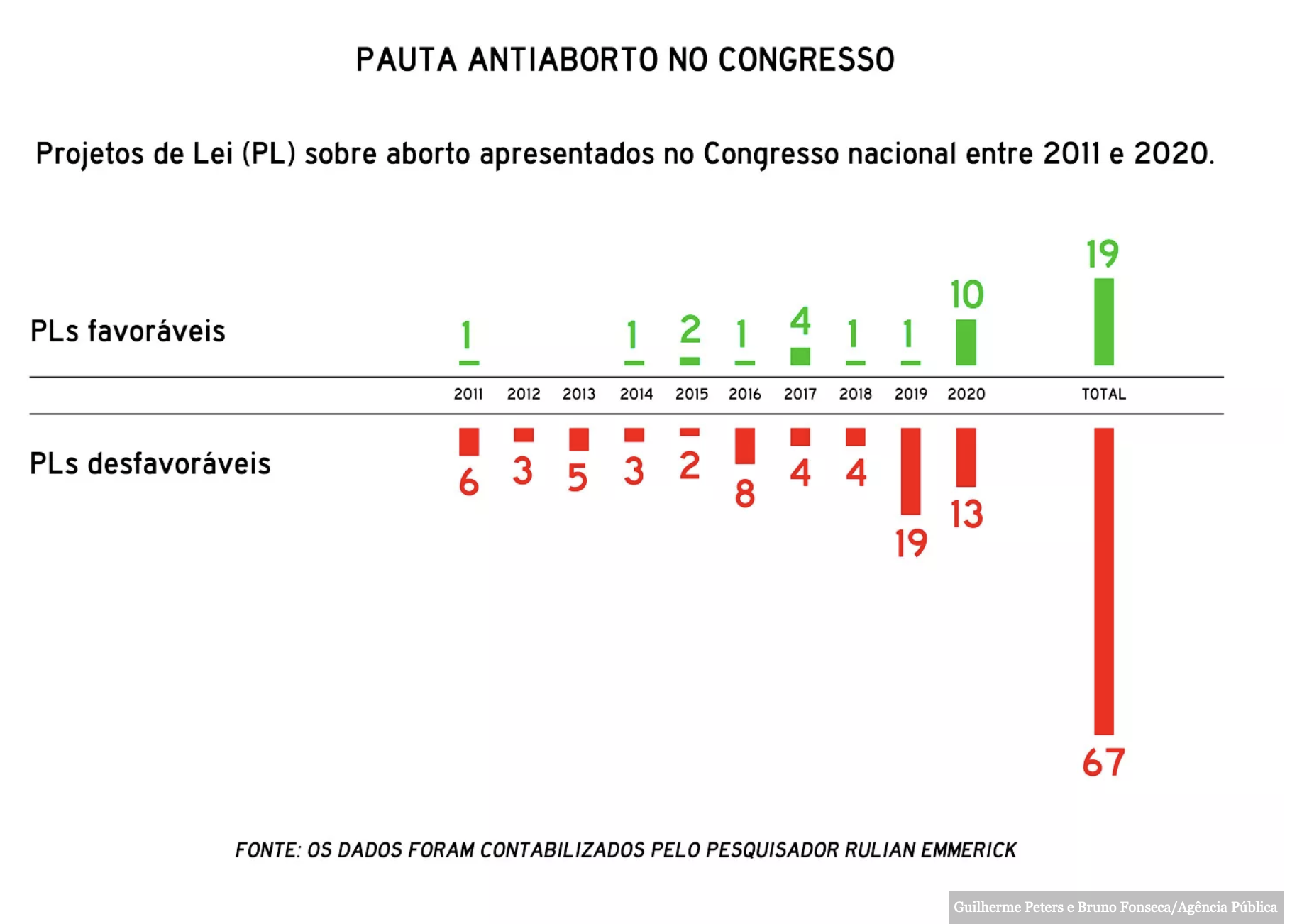 O pesquisador Rulian Emmerick acompanha um recorte ainda mais pontual: apenas propostas que falam diretamente sobre aborto. Em 2020, já em contexto de pandemia, ele diz que “13 dos 23 PLs sobre aborto apresentados no Congresso Nacional eram desfavoráveis aos direitos das mulheres”. Autor de livros sobre aborto, religião e direitos reprodutivos e professor de sociologia da Universidade Federal Rural do Rio de Janeiro (UFRRJ), Emmerick afirma que, nos primeiros dois anos do governo Bolsonaro, a quantidade de propostas que tentaram criminalizar ainda mais o aborto foi “três vezes maior do que as favoráveis à descriminalização”. “Todos os 19 PLs apresentados em 2019 eram desfavoráveis”, destaca.