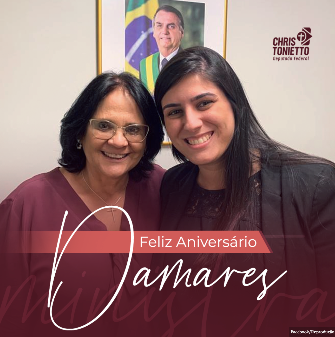 A deputada Chris Tonietto publicou um post em sua página no Facebook parabenizando a ministra Damares Alves pelo seu aniversário