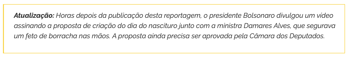 Nesse mesmo evento, o senador Eduardo Girão anunciou o Projeto de Lei 5.435/20, que ficaria conhecido como “Bolsa Estupro”. Nomeado como Estatuto da Gestante, o PL pretendia criar um incentivo financeiro para que vítimas de estupro não abortassem. Depois de forte reação da opinião pública, a senadora Simone Tebet (MDB-MS), relatora atual da proposta, apresentou um substitutivo que retira esse artigo. No entanto, grupos feministas defendem a anulação do projeto e dizem que o inteiro teor, não apenas um artigo, ameaça os direitos das mulheres.“A criação de um Estatuto do Nascituro é como equiparar o feto a uma criança nascida. Como criar um ECA [Estatuto da Criança e do Adolescente para o feto], ou seja, dar poder político ao feto”, considera Masra Abreu, do Cfemea. Recentemente o Ministério da Mulher, Família e Direitos Humanos lançou uma consulta pública para criação do Dia Nacional do Nascituro e de Conscientização dos Riscos do Aborto, em 8 de outubro. A consulta recebeu 138 contribuições, “a maioria favoráveis”, segundo o ministério. O projeto está sob análise da Casa Civil e da Secretaria de Governo da Presidência da República e, de acordo com a pasta, ainda será apresentado.