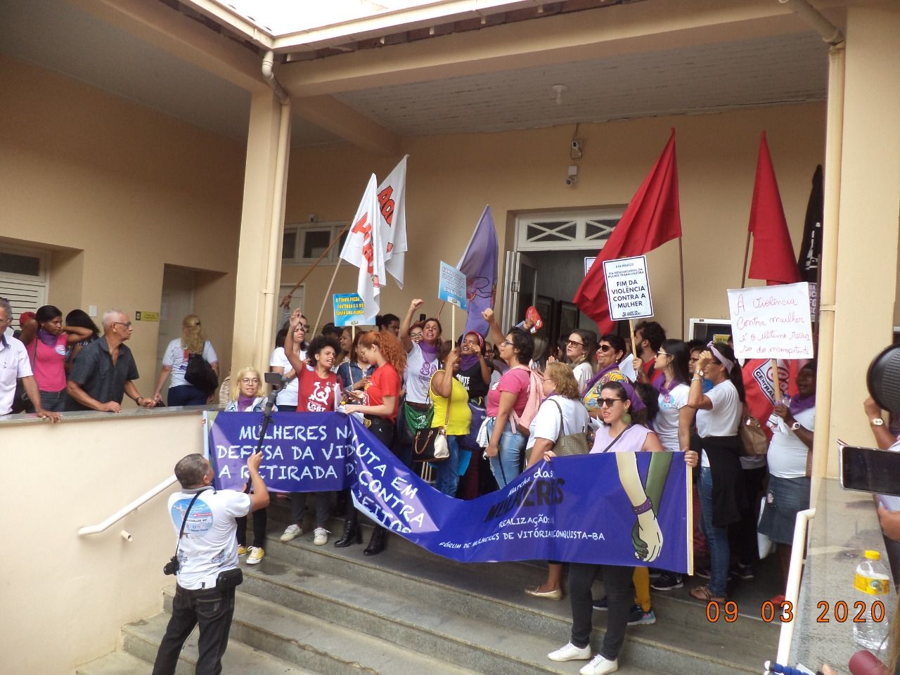 A manifestação, organizada pelo Fórum de Mulheres, criticou também o prefeito, Herzem Gusmão, pelo fechamento das escolas na zona rural de Conquista, e as reformas do governador Rui Costa e do presidente Jair Bolsonaro 9 de março de 2020 Clara Filippo e Tiago de LimaNesta segunda- feira (09/03) aconteceu a 4ª Marcha das Mulheres tendo como lema “em defesa da vida e contra a retirada de diretos”, em Vitória da Conquista. A concentração começou às 8h30 em frente à Prefeitura Municipal, e seguiu, depois, pelas ruas do Centro da cidade. O movimento foi organizado pelo Fórum de Mulheres em conjunto com representantes de coletivos feministas, por vereadores da Câmara Municipal de Conquista, sindicatos de professores do ensino público municipal e estadual (Simmp e APLB), da educação superior (Adusb) e dos bancários, movimentos sociais estudantis e LGBT e representações da zona rural e do Movimento dos Trabalhadores Sem Terra (MST).