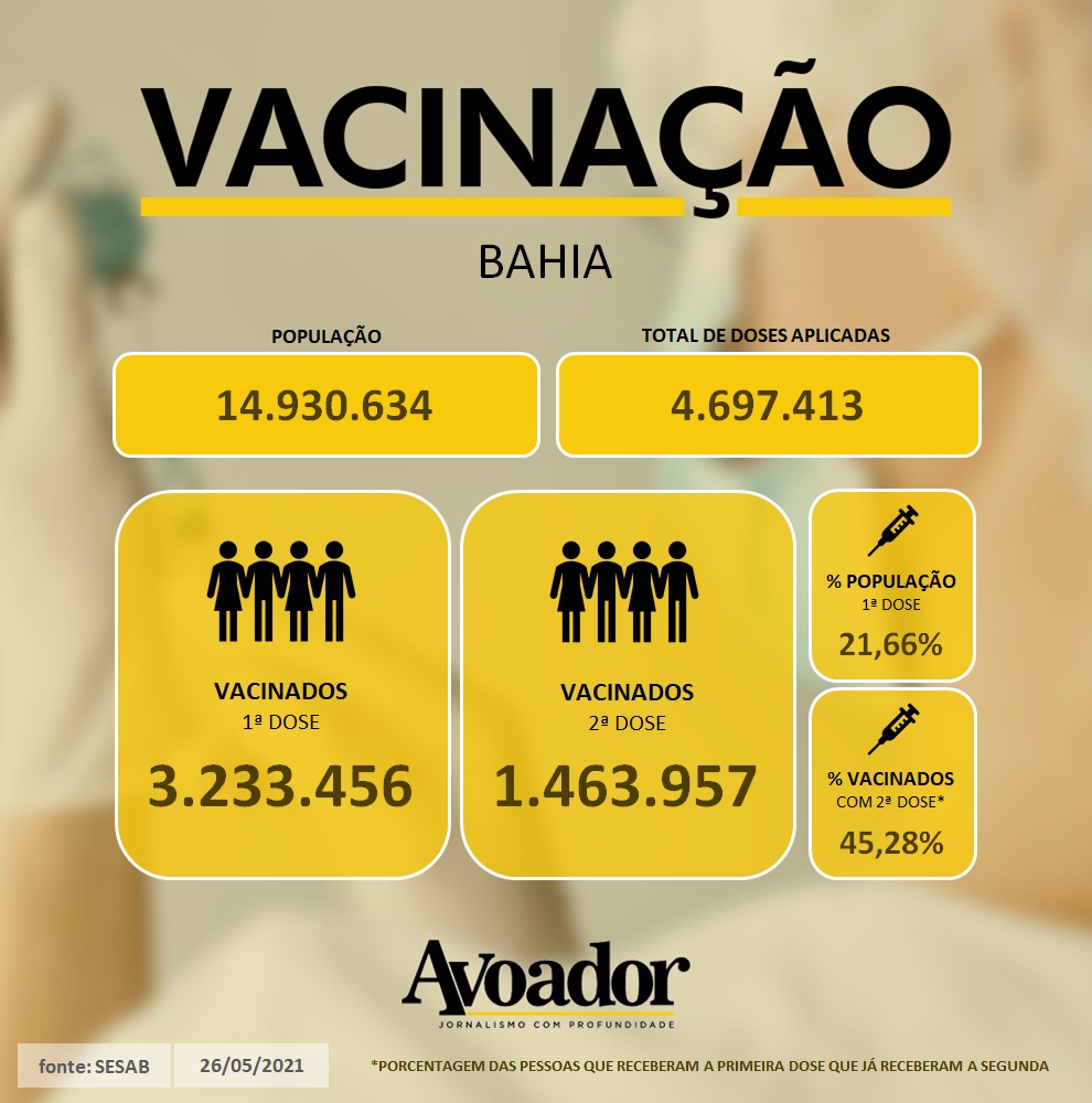 Em Vitória da Conquista, 101.164 doses das vacinas contra a covid-19 já foram aplicadas na população 26 de maio de 2021 Mariana OliveiraDesde que a campanha de vacinação contra a covid-19 iniciou no Brasil, em janeiro de 2021, a Bahia vacinou 4.697.413 pessoas com as duas doses necessárias para desenvolver a imunidade contra o coronavírus.