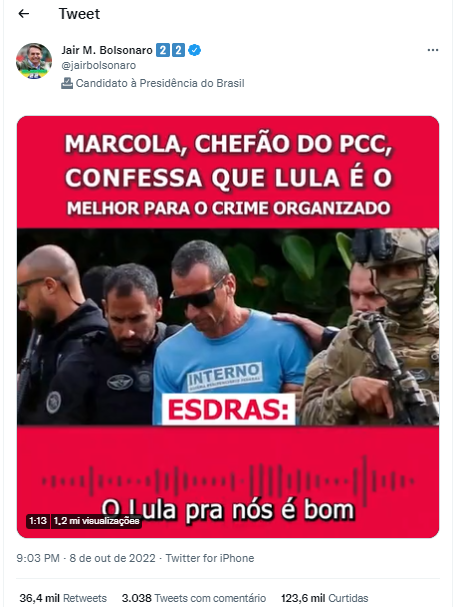 O mesmo texto foi replicado na página oficial de Jair Bolsonaro no Facebook, onde foi acompanhado de um vídeo com o áudio supostamente de Marcola, chefe da facção criminosa Primeiro Comando da Capital (PCC), dizendo que prefere Lula à Bolsonaro. O conteúdo chegou a 894 mil visualizações, 67,4 mil curtidas e 10 mil comentários.