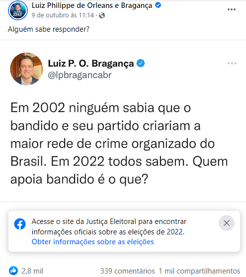 No Facebook, os dois posts com maior número de interações com a palavra-chave “crime organizado” entre 2 e 10 de outubro sustentam a narrativa de que Lula estaria sendo apoiado pelo crime, que veria em Bolsonaro um empecilho à ilegalidade. Um deles foi feito por Bolsonaro e o outro, pelo deputado federal Luiz Philippe de Orleans e Bragança (PL-SP).