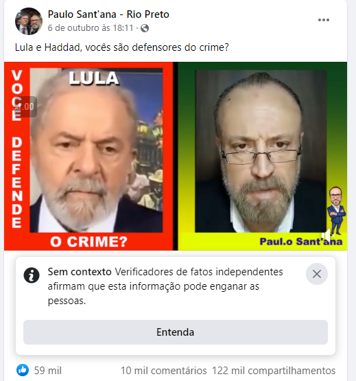 Essa foi a estratégia utilizada pelo perfil Paulo Sant’ana – Rio Preto, cujo vídeo ultrapassou 1.11 milhão de visualizações no Facebook. Na gravação, o dono do perfil simula uma conversa com Lula utilizando imagens que se repetem e dão a impressão de que o ex-presidente estaria ouvindo as afirmações sem responder. Sant’ana mostra as imagens falsas dos detentos supostamente comemorando os resultados da eleição e cenas violentas de roubos armados para insinuar que “Lula defende o crime”.