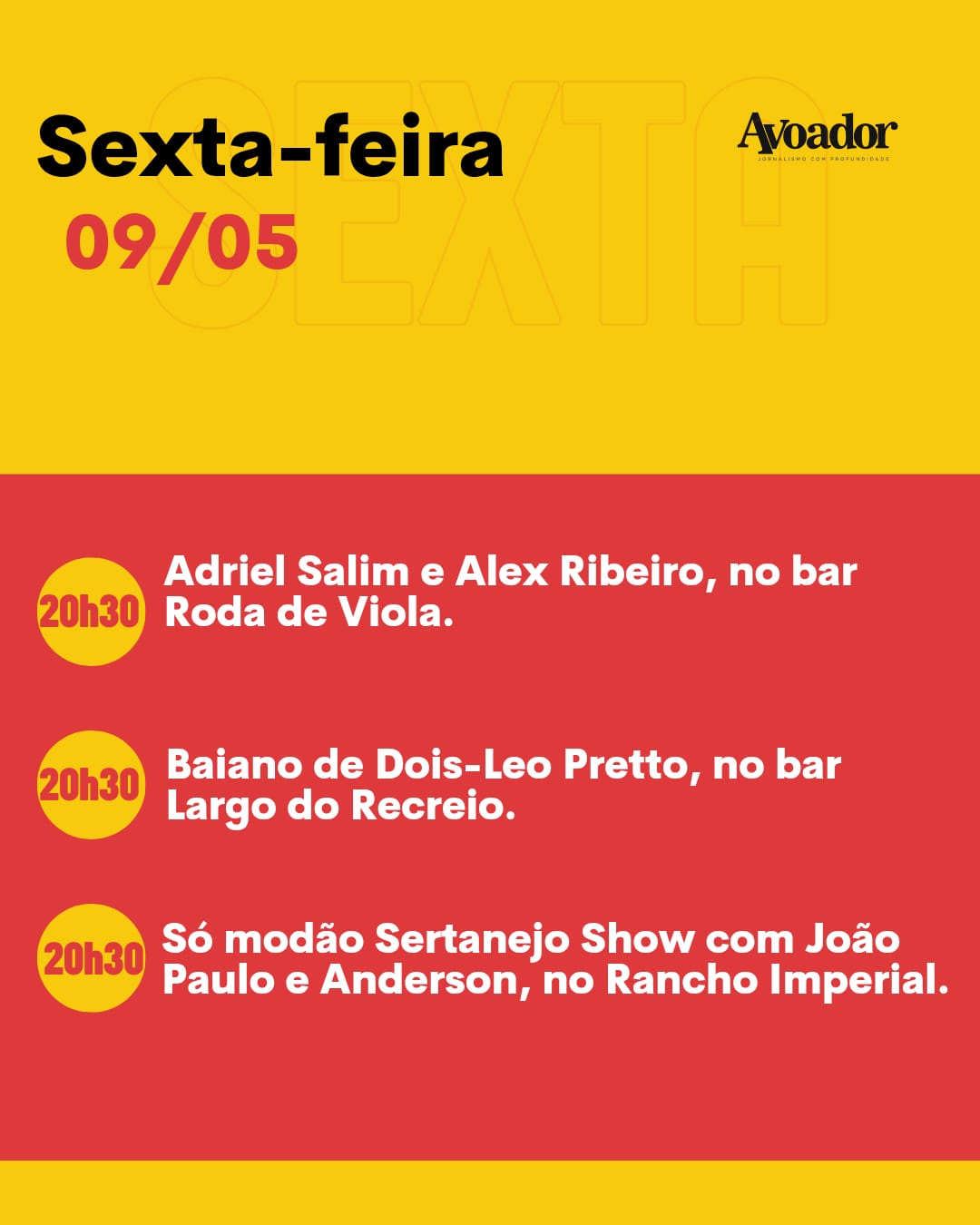 Na sexta-feira (09/05), os cantores Adriel Salim e Alex Ribeiro se apresentarão, às 20h30, no bar Roda de Viola, na rua Alziro Prates, n° 171, Candeias. No mesmo horário, a banda Baião de Dois-Leo Pretto estará no bar Largo do Recreio, na rua Lourival, n° 980, Recreio. O evento Só Modão Sertanejo Show recebe os artistas João Paulo e Anderson, às 20h, no Rancho Imperial, na rua Bolívia, bairro Jurema.