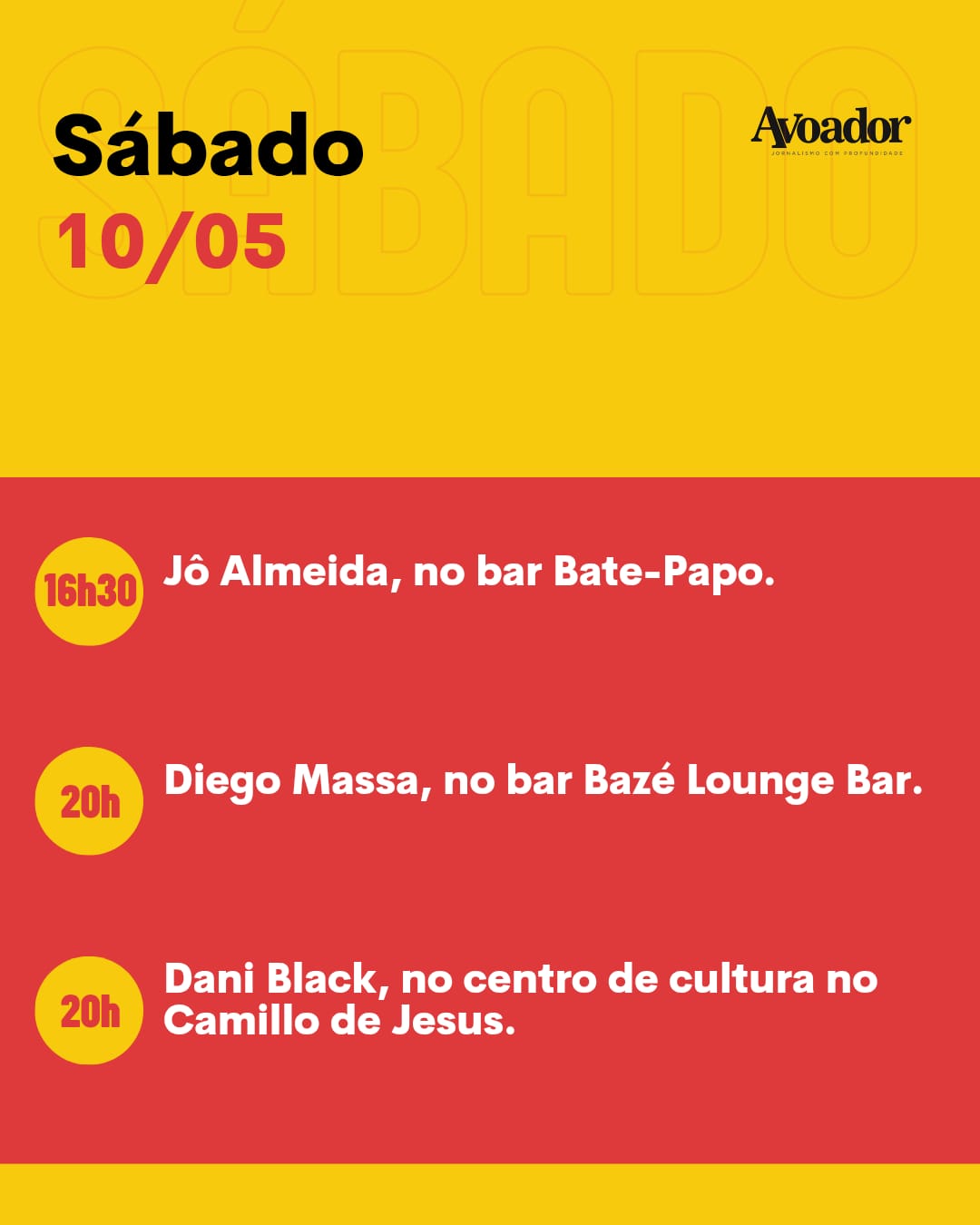 No sábado (10/05), às 16h30, a cantora Jô Almeida cantará no bar Bate-Papo, na avenida Alziro Prates, n° 71, Candeias. Já às 20h, o bar Bazé Louge Bar recebe o cantor Diogo Massa, na avenida Ivo Freire de Aguiar, Candeias. No mesmo horário, o cantor Dani Black é atração no Centro de Cultura Camillo de Jesus Lima, avenida Rosa Cruz, Candeias.