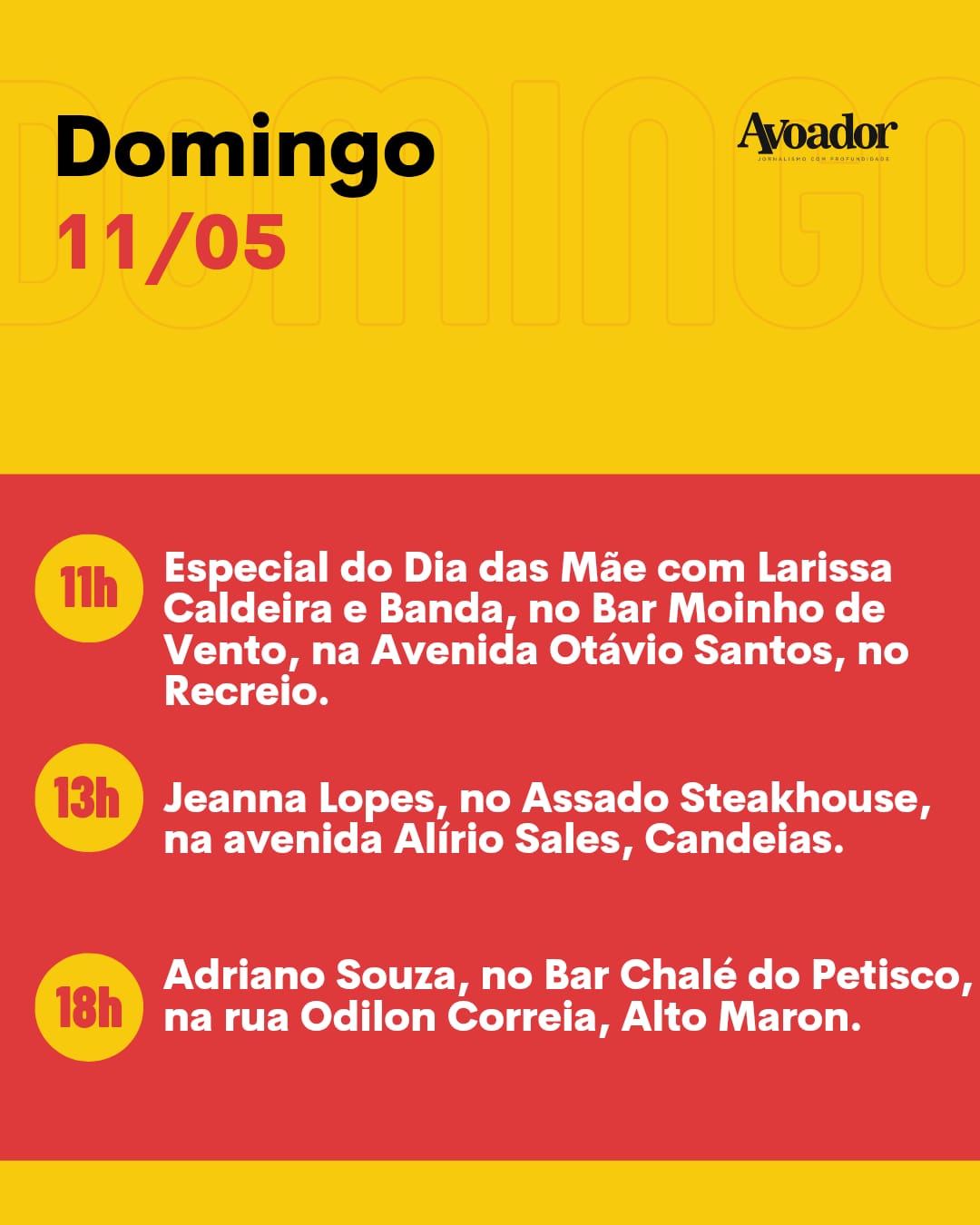 No domingo (11/05), o especial do Dia das Mães terá Larissa Caldeira e Banda, às 11h, no Bar Moinho, na avenida Otávio Santos, no Recreio. Às 13h, a cantora Jeanna Lopes estará no Assador Steakhouse, na avenida Alírio Sales, Candeias. O cantor Adriano Souza, às 18h, é o artista convidado no Bar Chalé do Petisco, na rua Odilon Correia, Alto Maron.