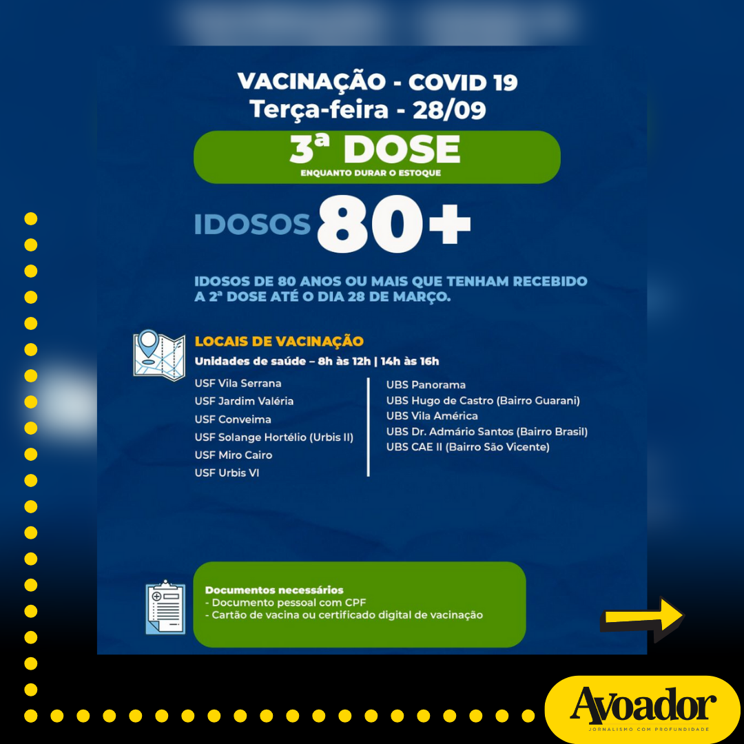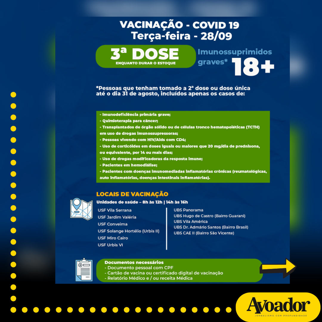 De acordo com a Secretaria Municipal de Saúde, serão vacinados os adolescentes de 12 a 17 anos, que residem nos povoados de Cercadinho, José Gonçalves e São Joaquim. Já na área urbana, o público contemplado da terceira dose serão os idosos maiores de 80 anos, desde que tenham se vacinado com a segunda dose até o dia 28 de março. Além disso, a vacinação com dose de reforço também irá contemplar os portadores de imunossupressão grave, com mais de 18 anos, que tenham completado sua imunização até o dia 31 de agosto.