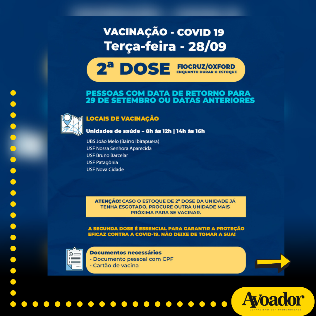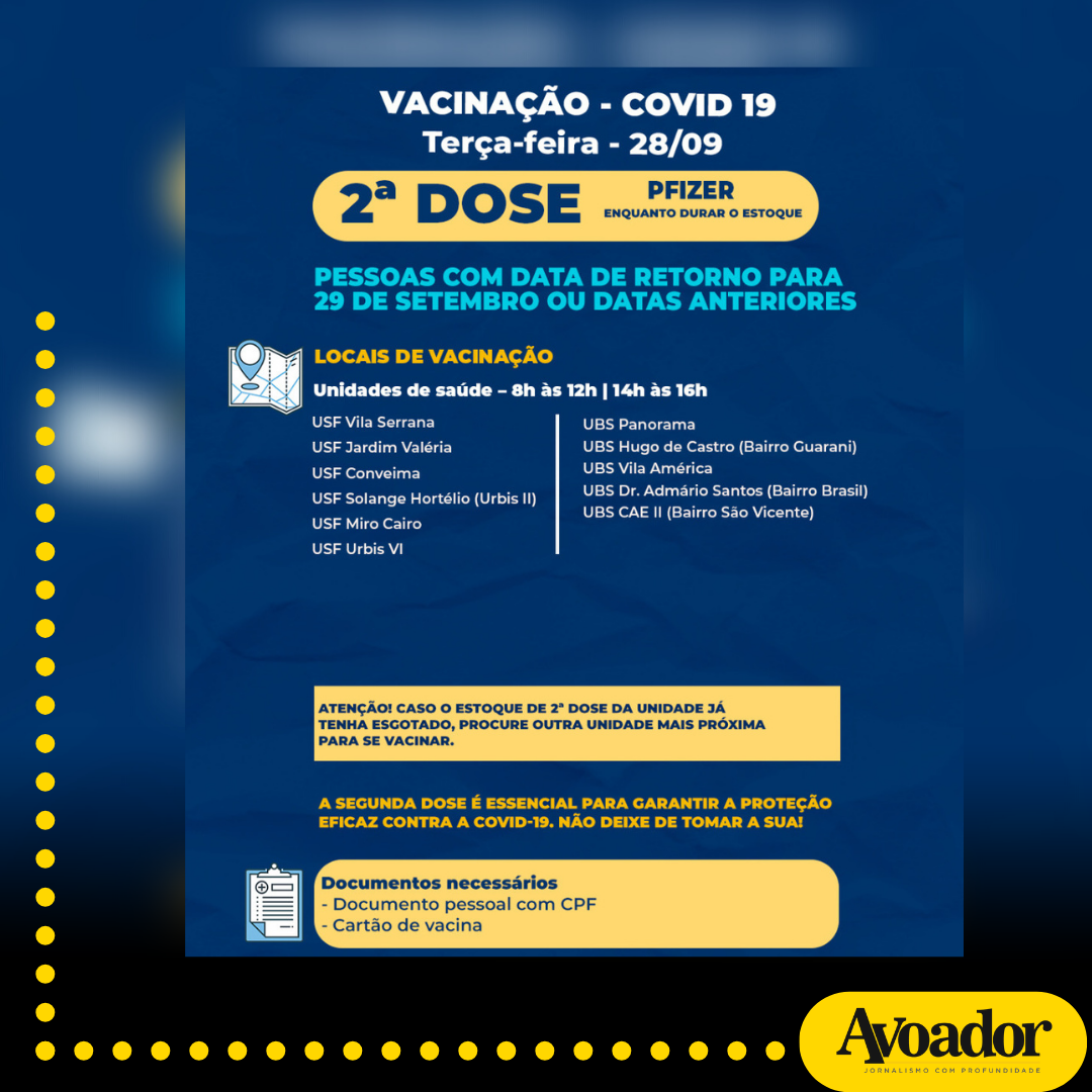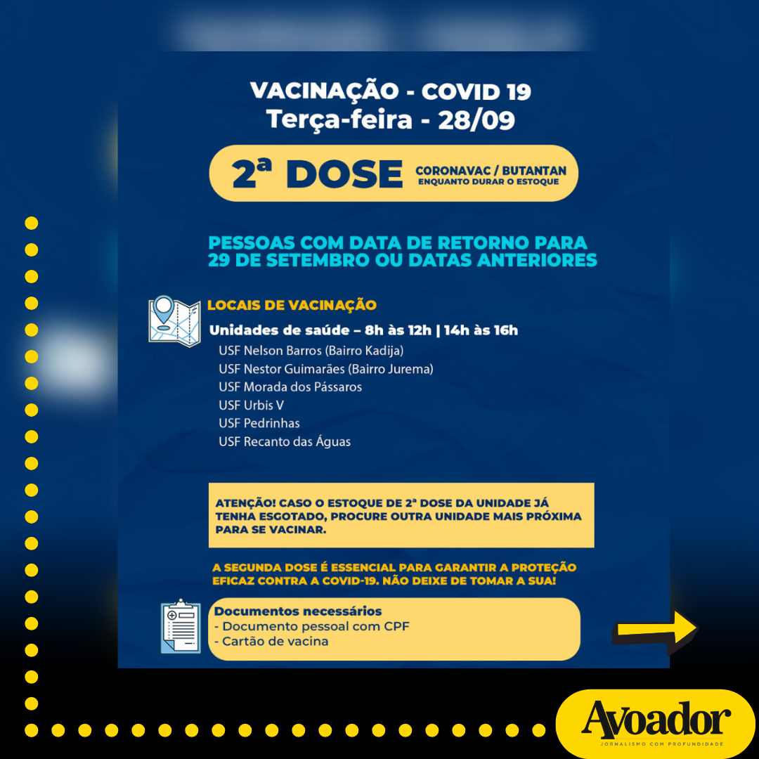 Para os que tomaram Coronavac/Butantan, a segunda dose estará disponível nas unidades de saúde da família Nelson Barros (Kadija); Nestor Guimarães (Jurema); Morada dos Pássaros; Urbis V; Pedrinhas ou Recanto das Águas.