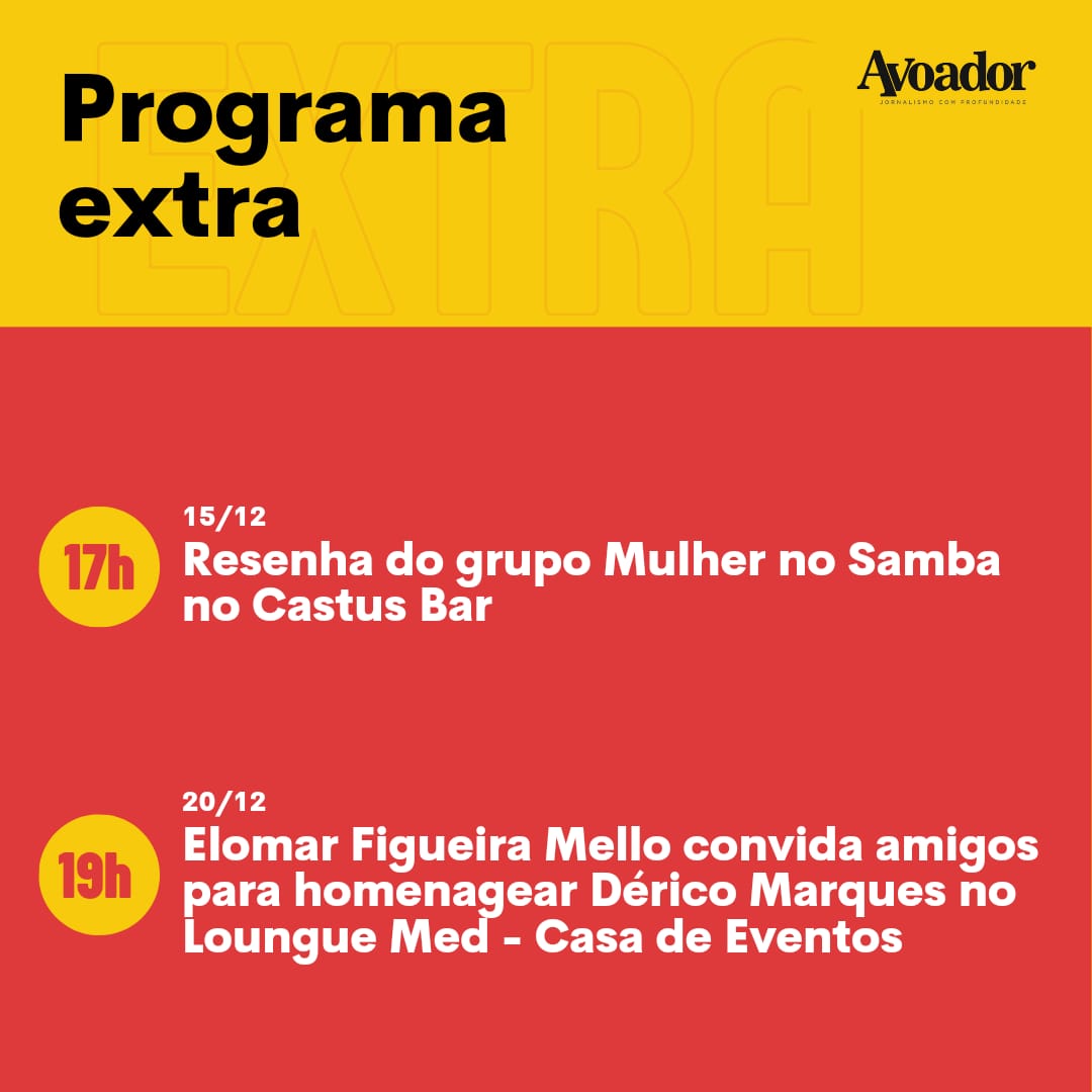 Já no dia 14, as crianças do Coral Tia Rita vão apresentar canções natalinas, às 18h, no Shopping Boulevard, a entrada é gratuita. No domingo (15/12), às 17h, o grupo Mulher no Samba se apresenta com participação de Geórgia, Katia Flavia, Narjara Paiva e Ferrugem no Castus Bar.