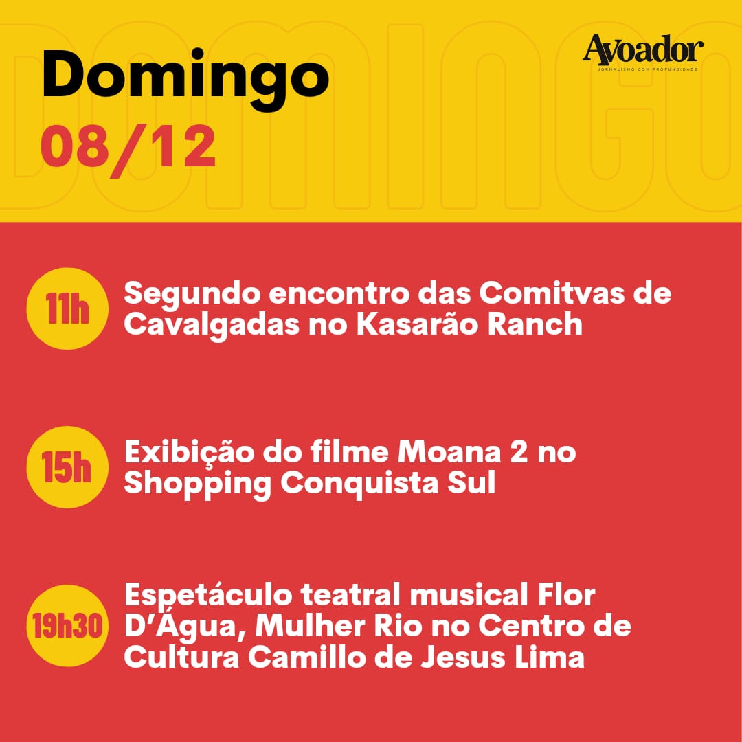Para o domingo (08/12), das 11h às 20h, no Kasarão Ranch, na rua da Granja, as Comitivas de Cavalgadas realizam o segundo encontro que contará com locução, shows, paredão, comidas típicas e bebidas. O filme “Moana 2” será exibido, no Shopping Conquista Sul, às 15h, a inteira é R$26,00, já a meia entrada e para crianças, fica em R$13,00. Pela noite, às 19h30, acontece o espetáculo teatral musical Flor D’Água, Mulher Rio, atuado e escrito por Sibelle Lelis e dirigido por Lucas Modesto, a atividade será no Centro de Cultura Camillo de Jesus Lima, a inteira saíra por R$ 40,00 mais uma taxa de R$4,00. Já a meia entrada custa R$20,00 com taxa de R$2,50.