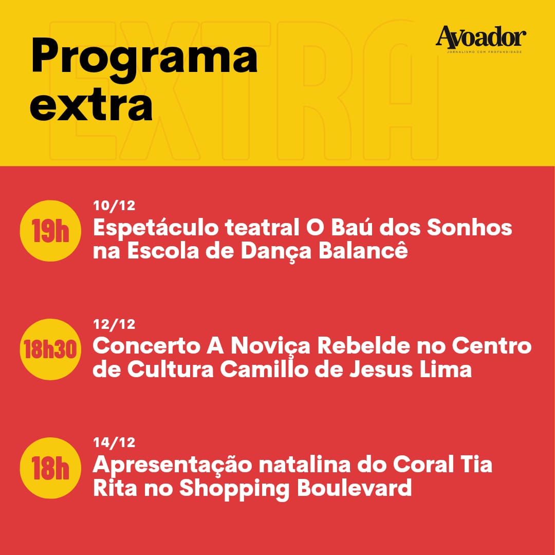 No dia 10 de dezembro, às 19h, vai acontecer a apresentação teatral “O Baú dos Sonhos*, na Escola de Dança Balancê. A peça é dirigida por Lu Hortélio e possui entrada gratuita. Na quinta-feira (12/12), o Coro Infantojuvenil de Vitória da Conquista e a Orquestra 9 de Novembro apresentarão o concerto “A Noviça Rebelde” , no auditório do Centro de Cultura Camillo de Jesus Lima, às 18h30. A entrada é gratuita, e os ingressos serão distribuídos por ordem de chegada, 30 minutos antes do evento.