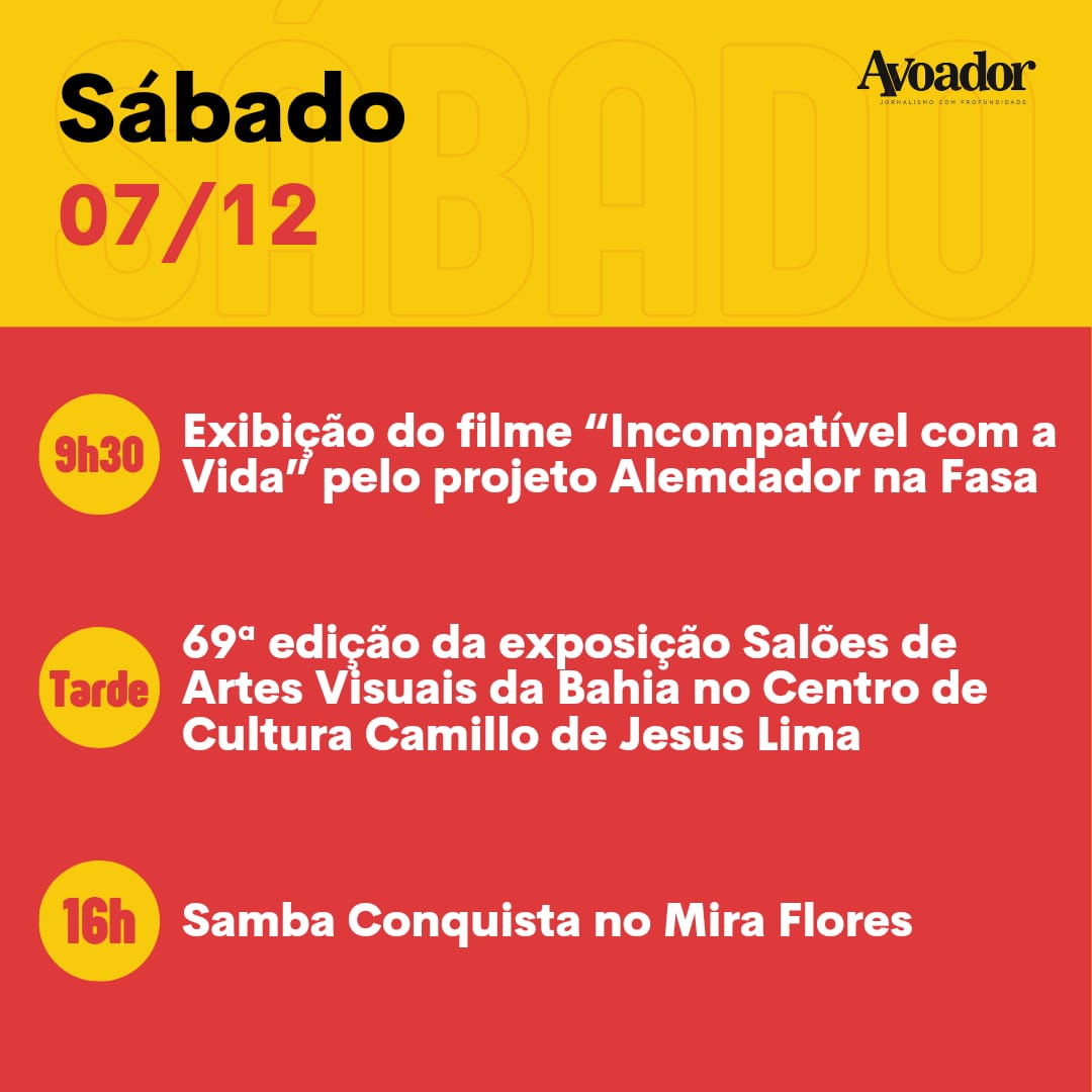 Durante a manhã de sábado (07/12), o Projeto de Extensão da Uesb Alemdador vai exibir o filme “Incompatível com a Vida”. A atividade ocorrerá, às 9h30, no auditório da Faculdade Santo Agostinho (Fasa), com certificado aos participantes. Os ingressos gratuitos estão disponíveis pelo site do Sympla. A tarde, o Centro de Cultura Camillo de Jesus Lima receberá a exposição “Salões de Artes Visuais da Bahia” que chega à 69ª edição, com uma mostra de obras premiadas de artistas de Vitória da Conquista, Jequié, Cândido Sales e Iguaí. A entrada é gratuita.