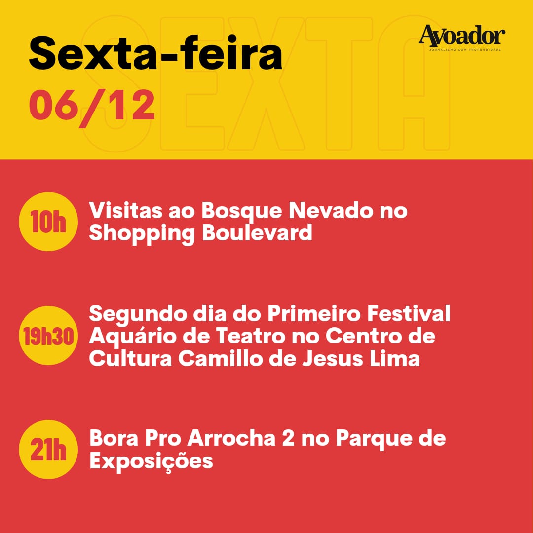 Na sexta-feira (06/12), a partir das 10h, o Shopping Buolevard está aberto às visitas para fotos na decoração de Natal, no Bosque Nevado. Às 19h30, será realizado o Primeiro Festival Aquário de Teatro com a releitura de “O Fantástico Mistério de Feiurinha”, que é promovido pela Cia Aquário de Teatro e Cinema, no Centro de Cultura Camillo de Jesus Lima. O ingresso custa R$30,00 a entrada inteira e a meia R$15,00.